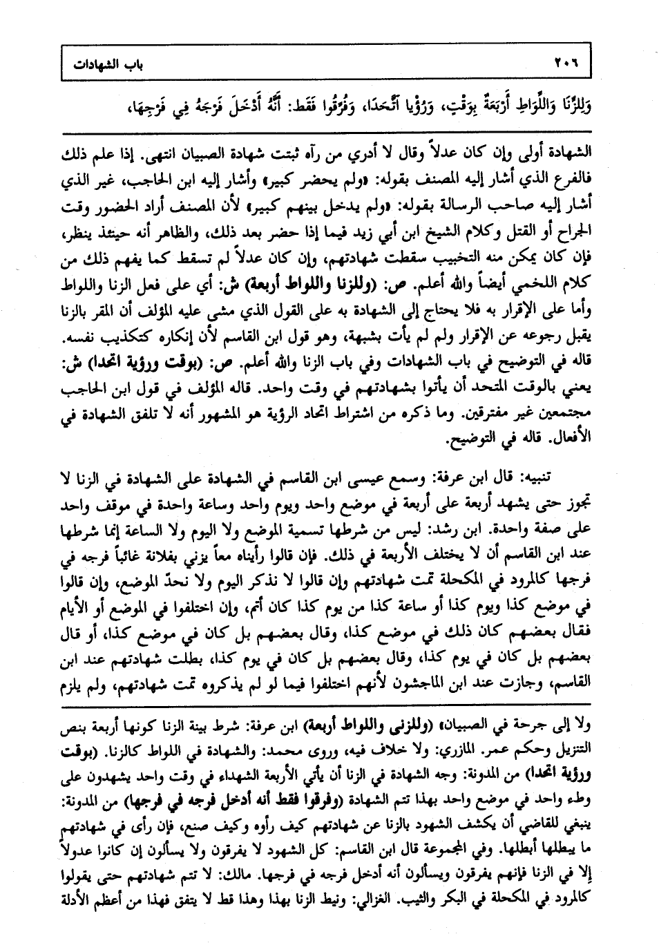 الشهادة أولى وإن كان عدلا، وقال: لا أدري من رآه ثبتت شهادة الصبيان انتهى. إذا علم ذلك فالفرع الذي أشار إليه المصنف بقوله ولم يحضر كبير وأشار إليه ابن الحاجب غير الذي أشار إليه صاحب الرسالة بقوله: "ولم يدخل بينهم كبير"؛ لأن المصنف أراد الحضور وقت الجراح أو القتل وكلام الشيخ ابن أبي زيد فيما إذا حضر بعد ذلك والظاهر أنه حينئذ ينظر فإن كان يمكن منه التخبيب سقطت شهادتهم وإن كان عدلا لم تسقط كما يفهم ذلك من كلام اللخمي أيضا والله أعلم. ص: (وللزنا واللواط أربعة) ش: أي على فعل الزنا واللواط، وأما على الإقرار به فلا يحتاج إلى الشهادة به على القول الذي مشى عليه المؤلف أن المقر بالزنا يقبل رجوعه عن الإقرار ولو لم يأت بشبهة وهو قول ابن القاسم؛ لأن إنكاره كتكذيب نفسه قاله في التوضيح في باب الشهادات وفي باب الزنا والله أعلم. ص: (بوقت ورؤية اتحدا) ش: يعني بالوقت المتحد أن يأتوا بشهادتهم في وقت واحد قاله المؤلف في قول ابن الحاجب مجتمعين غير مفترقين وما ذكره من اشتراط اتحاد الرؤية هو المشهور أنه لا تلفق الشهادة في الأفعال قاله في التوضيح.
