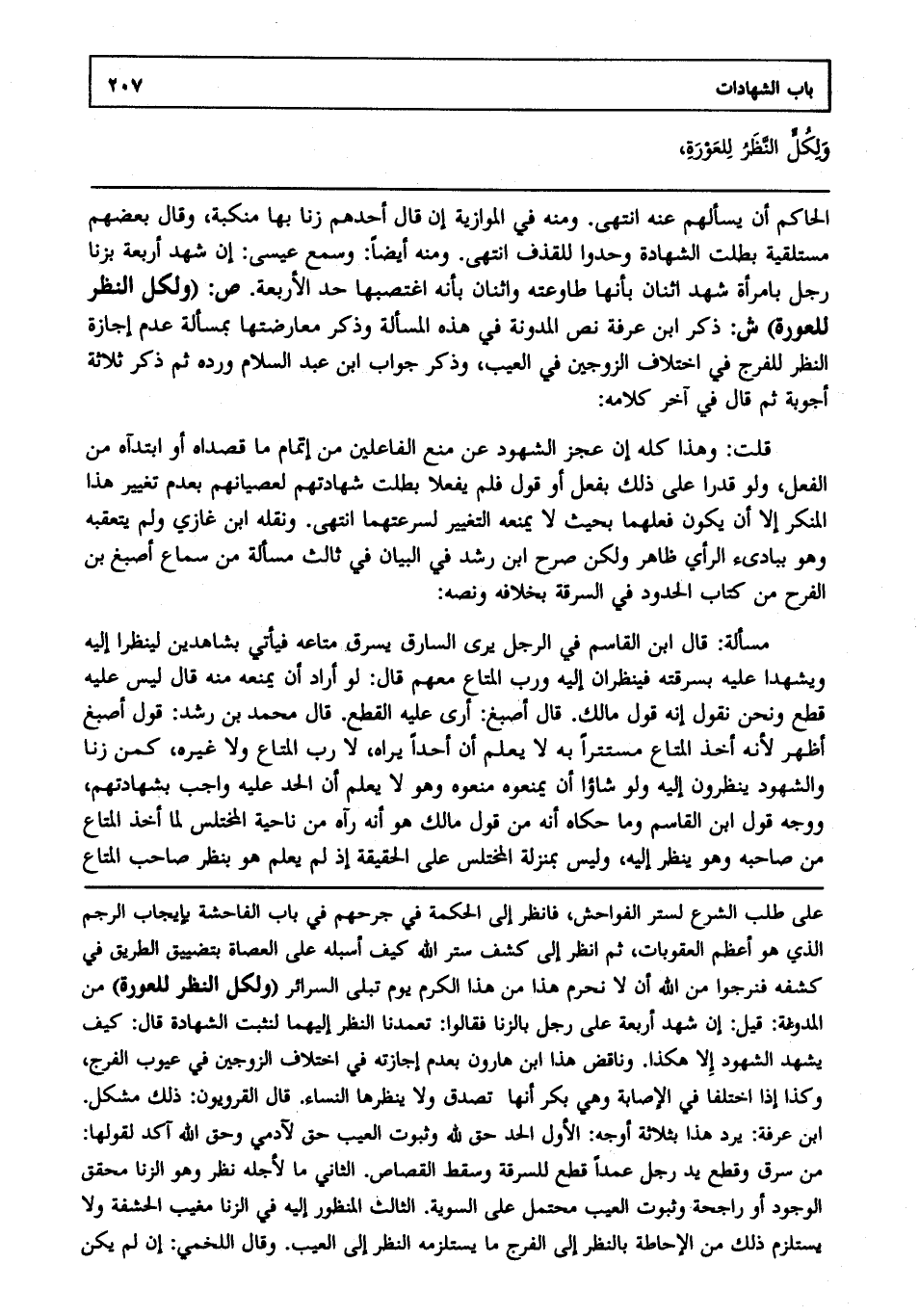 الحاكم أن يسألهم عنه انتهى. ومنه في الموازية إن قال أحدهم: زنا بها منكبة، وقال بعضهم: مستلقية- بطلت الشهادة وحدوا للقذف انتهى. ومنه أيضا وسمع عيسى إن شهد أربعة بزنا رجل بامرأة شهد اثنان بأنها طاوعته واثنان بأنه اغتصبها حد الأربعة. ص: (ولكل النظر للعورة) ش: ذكر ابن عرفة نص المدونة في هذه المسألة وذكر معارضتها بمسألة عدم إجازة النظر للفرج في اختلاف الزوجين في العيب وذكر جواب ابن عبد السلام ورده ثم ذكر ثلاثة أجوبة ثم قال في آخر كلامه: