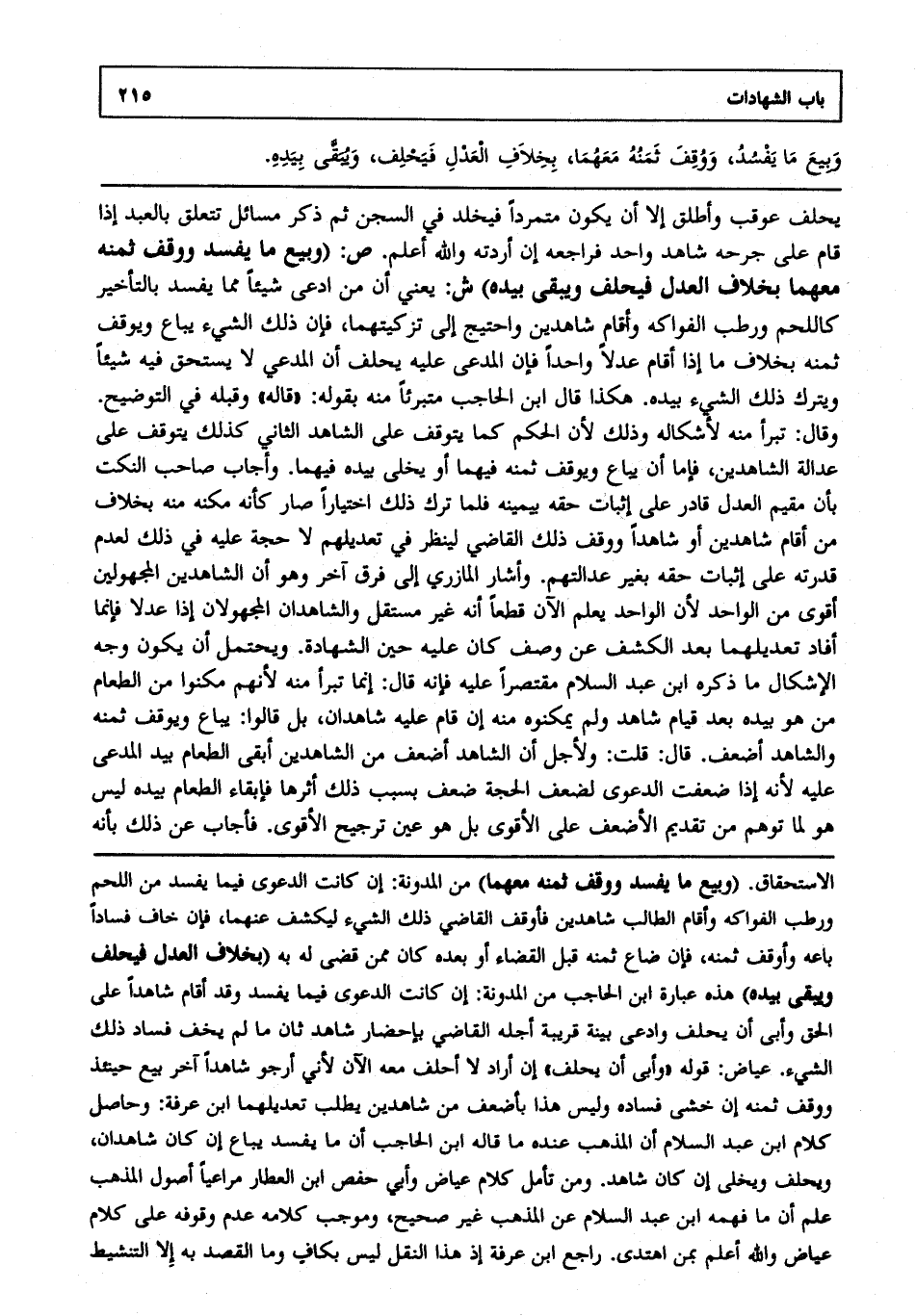 يحلف عوقب وأطلق إلا أن يكون متمردا فيخلد في السجن ثم ذكر مسائل تتعلق بالعبد إذا قام على جرحه شاهد واحد فراجعه إن أردته والله أعلم. ص: (وبيع ما يفسد ووقف ثمنه معهما بخلاف العدل فيحلف ويبقى بيده) ش: يعني أن من ادعى شيئا مما يفسد بالتأخير كاللحم ورطب الفواكه وأقام شاهدين واحتيج إلى تزكيتهما فإن ذلك الشيء يباع ويوقف ثمنه بخلاف ما إذا أقام عدلا واحدا فإن المدعى عليه يحلف أن المدعي لا يستحق فيه شيئا ويترك ذلك الشيء بيده هكذا قال ابن الحاجب متبرئا منه بقوله: "قاله"، وقبله في التوضيح وقال: تبرأ منه لإشكاله وذلك؛ لأن الحكم كما يتوقف على الشاهد الثاني كذلك يتوقف على عدالة الشاهدين فإما أن يباع ويوقف ثمنه فيهما أو يخلى بيده فيهما وأجاب صاحب النكت بأن مقيم العدل قادر على إثبات حقه بيمينه فلما ترك ذلك اختيارا صار كأنه مكنه منه بخلاف من أقام شاهدين أو شاهدا ووقف ذلك القاضي لينظر في تعديلهم لا حجة عليه في ذلك لعدم قدرته على إثبات حقه بغير عدالتهم، وأشار المازري إلى فرق آخر وهو أن الشاهدين المجهولين أقوى من الواحد؛ لأن الواحد يعلم الآن قطعا أنه غير مستقل، والشاهدان المجهولان إذا عدلا فإنما أفاد تعديلهما بعد الكشف عن وصف كان عليه حين الشهادة، ويحتمل أن يكون وجه الإشكال ما ذكره ابن عبد السلام مقتصرا عليه فإنه قال: إنما تبرأ منه لأنهم مكنوا من الطعام من هو بيده بعد قيام شاهد، ولم يمكنوه منه إن قام عليه شاهدان بل قالوا: يباع ويوقف ثمنه والشاهد أضعف. قال: قلت: ولأجل أن الشاهد أضعف من الشاهدين أبقي الطعام بيد المدعى عليه؛ لأنه إذا ضعفت الدعوى لضعف الحجة ضعف بسبب ذلك أثرها فإبقاء الطعام بيده ليس هو لما توهم من تقديم الأضعف على الأقوى بل هو عين ترجيح الأقوى فأجاب عن ذلك بأنه