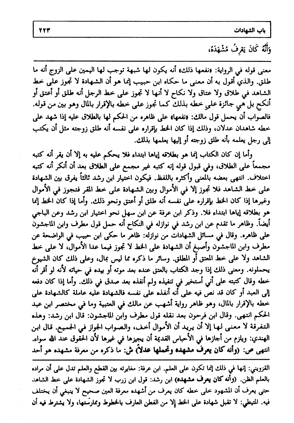 معنى قوله في الرواية: "نفعها ذلك" أنه يكون لها شبهة توجب لها اليمين على الزوج أنه ما طلق، والذي أقول به أن معنى ما حكاه ابن حبيب إنما هو أن الشهادة لا تجوز على خط الشاهد في طلاق ولا عتاق ولا نكاح لا أنها لا تجوز على خط الرجل أنه طلق أو أعتق أو أنكح بل هي جائزة على خطه بذلك كما تجوز على خطه بالإقرار بالمال وهو بين من قوله. فالصواب أن يحمل قول مالك: "نفعها" على ظاهره من الحكم لها بالطلاق عليه إذا شهد على خطه شاهدان عدلان وذلك إذا كان الخط بإقراره على نفسه أنه طلق زوجته مثل أن يكتب إلى رجل يعلمه بأنه طلق زوجته أو إليها يعلمها بذلك وأما إن كان الكتاب إنما هو بطلاقه إياها ابتداء فلا يحكم عليه به إلا أن يقر أنه كتبه مجمعا على الطلاق، وفي قبول قوله أنه كتبه غير مجمع على الطلاق بعد أن أنكر أنه كتبه اختلاف انتهى. بعضه بالمعنى وأكثره باللفظ فيكون اختيار ابن رشد ثالثا يفرق بين الشهادة على خط الشاهد فلا تجوز إلا في الأموال وبين الشهادة على خط المقر فتجوز في الأموال وغيرها إذا كان الخط بإقراره على نفسه أنه طلق أو أعتق ونحو ذلك وأما إذا كان الخط إنما هو بطلاقه إياها ابتداء فلا، وذكر ابن عرفة عن ابن سهل نحو اختيار ابن رشد وعن الباجي أيضا. وظاهر ما تقدم عن ابن رشد في نوازله في النكاح أنه حمل قول مطرف وابن الماجشون على ظاهره وقال في مسائل الشهادات من نوازله: ظاهر ما حكى ابن حبيب في الواضحة عن مطرف وابن الماجشون وأصبغ أن الشهادة على الخط لا تجوز فيما عدا الأموال لا على خط الشاهد ولا على خط المعتق أو المطلق وسائر ما ذكره مما ليس بمال. وعلى ذلك كان الشيوخ يحملونه، ومعنى ذلك إذا وجد الكتاب بالعتق عنده بعد موته أو بيده في حياته؛ لأنه لو أقر أنه خطه وقال كتبته على أني أستخير في تنفيذه ولم أنفذه بعد صدق في ذلك، وأما إذا كان دفعه إلى العبد أو كان قد نص فيه على أنه أنفذه على نفسه فالشهادة عليه عاملة كالشهادة على خطه بالإقرار بالمال وهو ظاهر رواية أشهب عن مالك في العتبية وما في مختصر ابن عبد الحكم انتهى. وقال ابن فرحون بعد نقله قول مطرف وابن الماجشون: قال ابن رشد: وهذه التفرقة لا معنى لها إلا أن يريد أن الأموال أخف والصواب الجواز في الجميع. قال ابن الهندي: ويلزم من أجازها في الأحباس القديمة أن يجيزها في غيرها؛ لأن الحقوق عند الله سواء انتهى. ص: (وأنه كان يعرف مشهده وتحملها عدلا) ش: ما ذكره من معرفة مشهده هو أحد