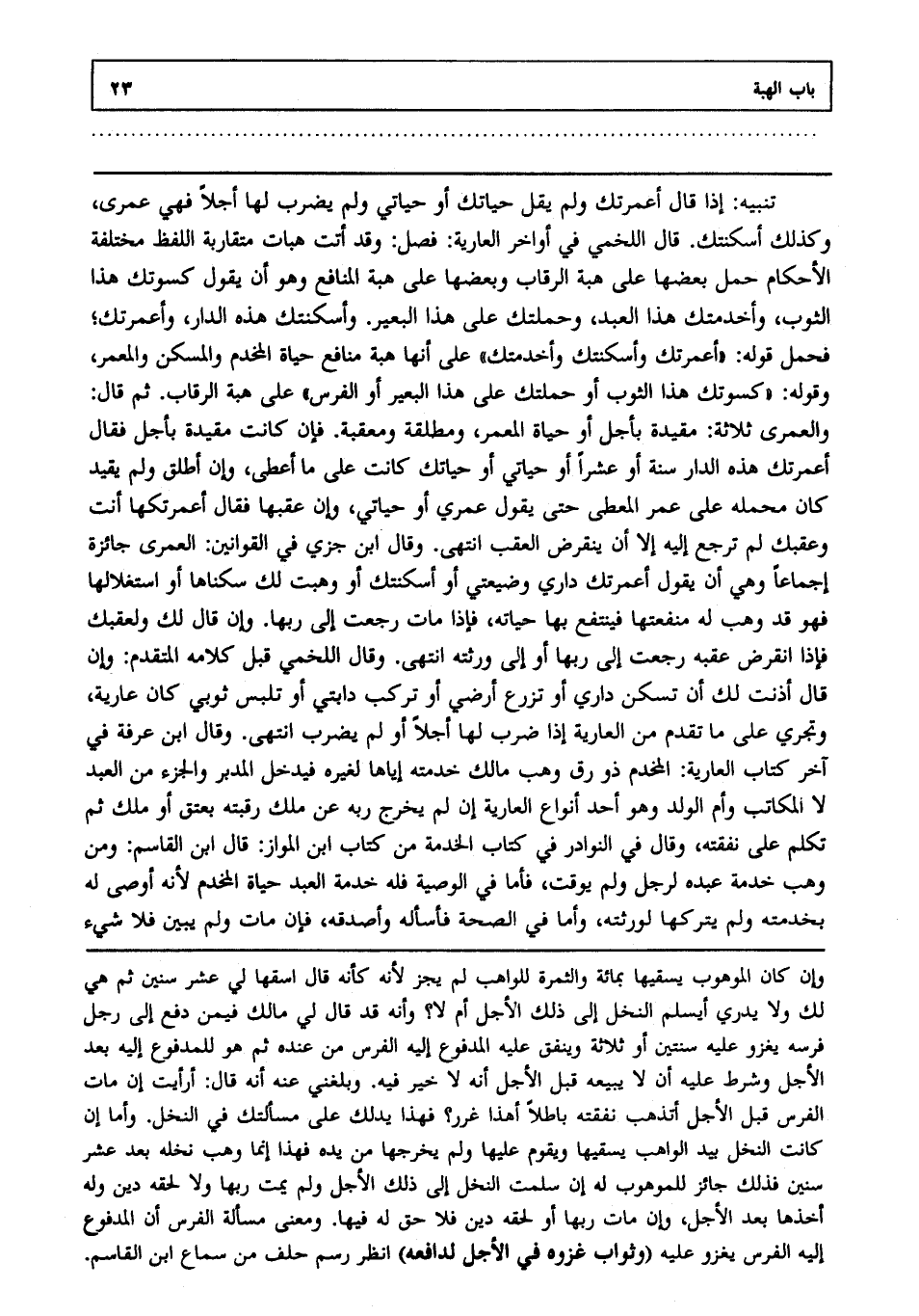 تنبيه: إذَا قَالَ: أَعْمَرْتُكَ وَلَمْ يَقُلْ حَيَاتَك أَوْ حَيَاتِي وَلَمْ يَضْرِبْ لَهَا أَجَلًا فَهِيَ عُمْرَى وَكَذَلِكَ أَسْكَنْتُك، قَالَ اللَّخْمِيُّ فِي أَوَاخِرِ الْعَارِيَّةِ: فصل: وَقَدْ أَتَتْ هِبَاتٌ مُتَقَارِبَةُ اللَّفْظِ مُخْتَلِفَةُ الْأَحْكَامِ حُمِلَ بَعْضُهَا عَلَى هِبَةِ الرِّقَابِ وَبَعْضُهَا عَلَى هِبَةِ الْمَنَافِعِ وَهُوَ أَنْ يَقُولَ: كَسَوْتُك هَذَا الثَّوْبَ وَأَخْدَمْتُك هَذَا الْعَبْدَ وَحَمَلْتُك عَلَى هَذَا الْبَعِيرِ وَأَسْكَنْتُك هَذِهِ الدَّارَ وَأَعْمَرْتُكَ فَحُمِلَ قَوْلُهُ: "أَعْمَرْتُكَ وَأَسْكَنْتُك وَأَخْدَمْتُك" عَلَى أَنَّهَا هِبَةُ مَنَافِعِ حَيَاةِ الْمُخْدَمِ وَالْمُسْكَنِ وَالْمُعَمَّرِ، وَقَوْلُهُ: "كَسَوْتُك هَذَا الثَّوْبَ أَوْ حَمَلْتُك عَلَى هَذَا الْبَعِيرِ أَوْ الْفَرَسِ" عَلَى هِبَةِ الرِّقَابِ ثُمَّ قَالَ: وَالْعُمْرَى ثَلَاثَةٌ مُقَيَّدَةٌ بِأَجَلٍ أَوْ حَيَاةِ الْمُعَمَّرِ وَمُطْلَقَةٌ وَمُعْقَبَةٌ فَإِنْ كَانَتْ مُقَيَّدَةٌ بِأَجَلٍ فَقَالَ: أَعْمَرْتُكَ هَذِهِ الدَّارَ سَنَةً أَوْ عَشْرًا أَوْ حَيَاتِي أَوْ حَيَاتَك كَانَتْ عَلَى مَا أَعْطَى، وَإِنْ أَطْلَقَ وَلَمْ يُقَيِّدْ كَانَ مَحْمَلُهُ عَلَى عُمُرِ الْمُعْطِي حَتَّى يَقُولَ: عُمُرِي أَوْ حَيَاتِي وَإِنْ عَقَّبَهَا فَقَالَ: أَعْمَرْتُكَهَا أَنْتَ وَعَقِبَك لَمْ تَرْجِعْ إلَيْهِ إلَّا أَنْ يَنْقَرِضَ الْعَقِبُ، انْتَهَى. وَقَالَ ابْنُ جُزَيٍّ فِي الْقَوَانِينَ: الْعُمْرَى جَائِزَةٌ إجْمَاعًا وَهِيَ أَنْ يَقُولَ: أَعْمَرْتُكَ دَارِي وَضَيْعَتِي أَوْ أَسْكَنْتُك أَوْ وَهَبْت لَكَ سُكْنَاهَا أَوْ اسْتِغْلَالَهَا فَهُوَ قَدْ وَهَبَ لَهُ مَنْفَعَتَهَا فَيَنْتَفِعُ بِهَا حَيَاتَهُ فَإِذَا مَاتَ رَجَعَتْ إلَى رَبِّهَا وَإِنْ قَالَ: لَك وَلِعَقِبِك فَإِذَا انْقَرَضَ عَقِبُهُ رَجَعَتْ إلَى رَبِّهَا أَوْ إلَى وَرَثَتِهِ، انْتَهَى. وَقَالَ اللَّخْمِيُّ قَبْلَ كَلَامِهِ الْمُتَقَدِّمِ: وَإِنْ قَالَ: أَذِنْت لَكَ أَنْ تَسْكُنَ دَارِي أَوْ تَزْرَعَ أَرْضِي أَوْ تَرْكَبَ دَابَّتِي أَوْ تَلْبِسَ ثَوْبِي كَانَ عَارِيَّةً وَتَجْرِي عَلَى مَا تَقَدَّمَ مِنْ الْعَارِيَّةِ إذَا ضَرَبَ لَهَا أَجَلًا أَوْ لَمْ يَضْرِبْ، انْتَهَى. وَقَالَ ابْنُ عَرَفَةَ فِي آخِرِ كِتَابِ الْعَارِيَّةِ: الْمُخْدِمُ ذُو رِقٍّ وَهَبَ مَالِكٌ خِدْمَتِهِ إيَّاهَا لِغَيْرِهِ فَيَدْخُلُ الْمُدَبَّرُ وَالْجُزْءُ مِنْ الْعَبْدِ لَا الْمُكَاتَبُ وَأُمُّ الْوَلَدِ وَهُوَ أَحَدُ أَنْوَاعِ الْعَارِيَّةِ إنْ لَمْ يُخْرِجْ رَبُّهُ عَنْ مِلْكِ رَقَبَتِهِ بِعِتْقٍ أَوْ مِلْكٍ ثُمَّ تَكَلَّمَ عَلَى نَفَقَتِهِ وَقَالَ فِي النَّوَادِرِ فِي كِتَابِ الْخِدْمَةِ مِنْ كِتَابِ ابْنِ الْمَوَّازِ، قَالَ ابْنُ الْقَاسِمِ: وَمَنْ وَهَبَ خِدْمَةَ عَبْدِهِ لِرَجُلٍ وَلَمْ يُوَقِّتْ فَأَمَّا فِي الْوَصِيَّةِ فَلَهُ خِدْمَةُ الْعَبْدِ حَيَاةَ الْمُخْدَمِ؛ لِأَنَّهُ أَوْصَى لَهُ بِخِدْمَتِهِ وَلَمْ يَتْرُكْهَا لِوَرَثَتِهِ وَأَمَّا فِي الصِّحَّةِ فَأَسْأَلُهُ وَأُصَدِّقُهُ فَإِنْ مَاتَ وَلَمْ يُبَيِّنْ فَلَا شَيْءَ