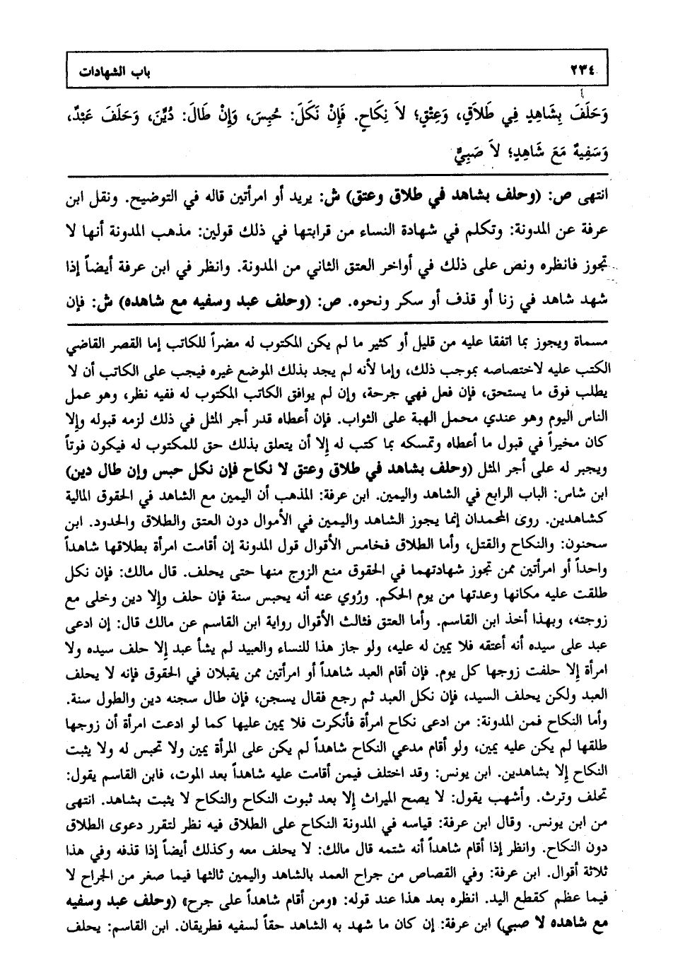 انتهى. ص: (وحلف بشاهد في طلاق وعتق) ش: يريد أو امرأتين قاله في التوضيح ونقل ابن عرفة عن المدونة وتكلم في شهادة النساء من قرابتها، في ذلك قولين مذهب المدونة أنها لا تجوز فانظره ونص على ذلك في أواخر العتق الثاني من المدونة وانظر في ابن عرفة أيضا إذا شهد شاهد في زنا أو قذف أو سكر ونحوه. ص: (وحلف عبد وسفيه مع شاهده) ش: فإن