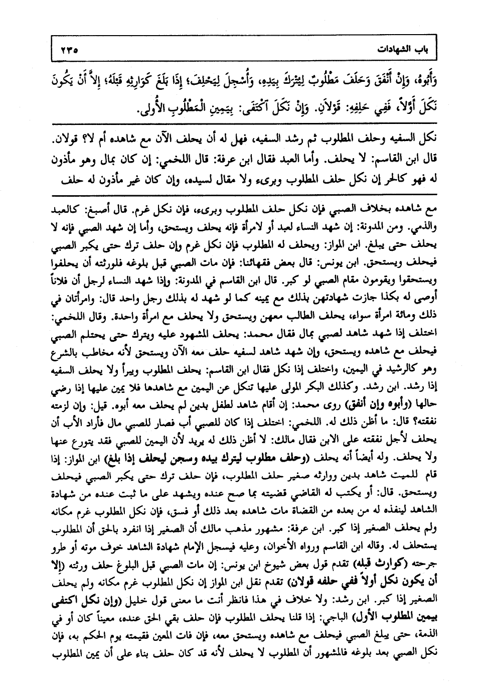 نكل السفيه وحلف المطلوب ثم رشد السفيه فهل له أن يحلف الآن مع شاهده أم لا؟ قولان: قال ابن القاسم: لا يحلف، وأما العبد فقال ابن عرفة: قال اللخمي: إن كان بمال وهو مأذون له فهو كالحر إن نكل حلف المطلوب وبرئ ولا مقال لسيده وإن كان غير مأذون له حلف