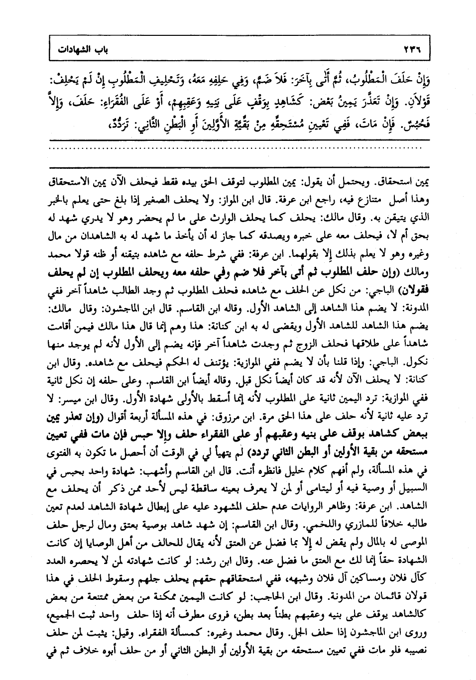 وإن حلف المطلوب ثم أتى بآخر فلاضم، وفي حلفه معه وتحليف المطلوب إن لم يحلف قولان. وإن تعذر يمين بعض كشاهد بوقف على بنيه وعقبهم أو على الفقراء حلف وإلا فحبس، فإن مات ففي تعيين مستحقه من بقية الأولين أو البطن الثاني تردد.