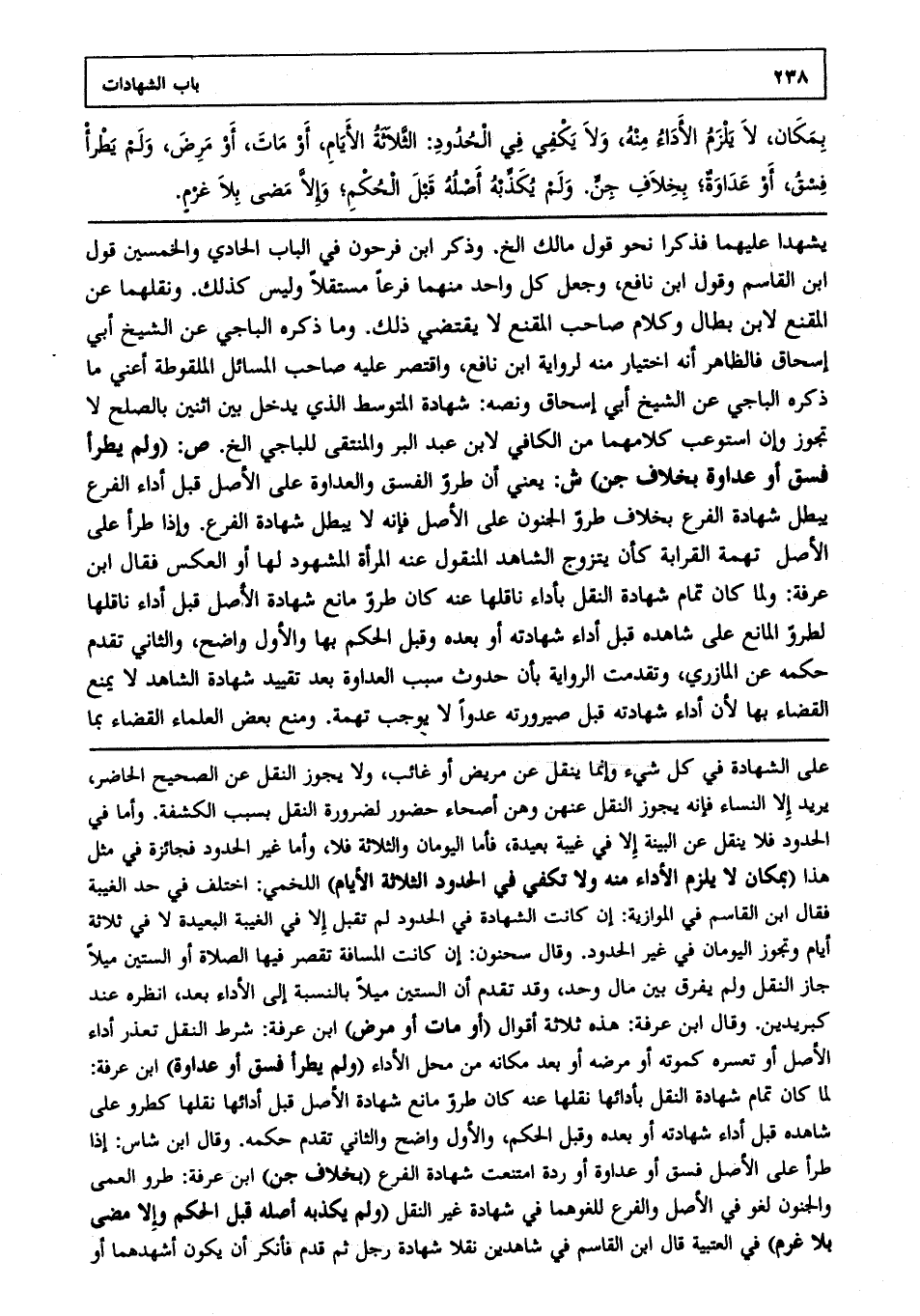 يشهدا عليهما فذكرا نحو قول مالك إلخ وذكر ابن فرحون في الباب الحادي والخمسين قول ابن القاسم وقول ابن نافع وجعل كل واحد منهما فرعا مستقلا وليس كذلك ونقلهما عن المقنع لابن بطال، وكلام صاحب المقنع لا يقتضي ذلك وما ذكره الباجي عن الشيخ أبي إسحاق فالظاهر أنه اختيار منه لرواية ابن نافع واقتصر عليه صاحب المسائل الملقوطة أعني ما ذكره الباجي عن الشيخ أبي إسحاق ونصه: شهادة المتوسط الذي يدخل بين اثنين بالصلح لا تجوز وإن استوعب كلامهما من الكافي لابن عبد البر والمنتقى للباجي إلخ. ص: (ولم يطرأ فسق أو عداوة بخلاف جن) ش: يعني أن طرو الفسق والعداوة على الأصل قبل أداء الفرع يبطل شهادة الفرع بخلاف طرو الجنون على الأصل فإنه لا يبطل شهادة الفرع، وإذا طرأ على الأصل تهمة القرابة كأن يتزوج الشاهد المنقول عنه المرأة المشهود لها أو العكس فقال ابن عرفة: ولما كان تمام شهادة النقل بأداء ناقلها عنه كان طرو مانع شهادة الأصل قبل أداء ناقلها لطرو المانع على شاهده قبل أداء شهادته أو بعده وقبل الحكم بها، والأول واضح والثاني تقدم حكمه عن المازري وتقدمت الرواية بأن حدوث سبب العداوة بعد تقييد شهادة الشاهد لا يمنع القضاء بها؛ لأن أداء شهادته قبل صيرورته عدوا لا يوجب تهمة، ومنع بعض العلماء القضاء بما