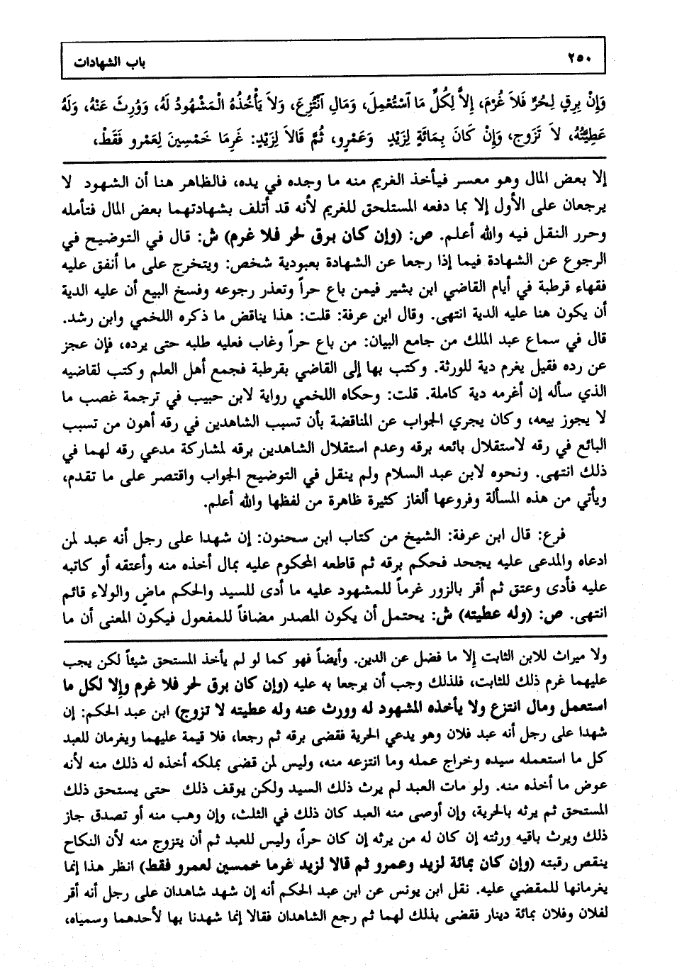 إلا بعض المال وهو معسر فيأخذ الغريم منه ما وجده في يده، فالظاهر هنا أن الشهود لا يرجعان على الأول إلا بما دفعه المستلحق للغريم؛ لأنه قد أتلف بشهادتهما بعض المال فتأمله وحرر النقل فيه والله أعلم. ص: (وإن كان برق لحر فلا غرم). ش: قال في التوضيح في الرجوع عن الشهادة فيما إذا رجعا عن الشهادة بعبودية شخص ويتخرج على ما اتفق عليه فقهاء قرطبة في أيام القاضي ابن بشير فيمن باع حرا وتعذر رجوعه وفسخ البيع أن عليه الدية أن يكون هنا عليه الدية انتهى. وقال ابن عرفة: قلت: هذا يناقض ما ذكره اللخمي وابن رشد قال في سماع عبد الملك من جامع البيان: من باع حرا وغاب فعليه طلبه حتى يرده فإن عجز عن رده فقيل: يغرم دية للورثة، وكتب بها إلى القاضي بقرطبة فجمع أهل العلم وكتب لقاضيه الذي سأله أن أغرمه دية كاملة. قلت: وحكاه اللخمي رواية لابن حبيب في ترجمة غصب ما لا يجوز بيعه، وكان يجري الجواب عن المناقضة بأن تسبب الشاهدين في رقه أهون من تسبب البائع في رقه لاستقلال بائعه برقه وعدم استقلال الشاهدين برقه لمشاركة مدعي رقه لهما في ذلك انتهى. ونحوه لابن عبد السلام ولم ينقل في التوضيح الجواب واقتصر على ما تقدم ويأتي من هذه المسألة وفروعها ألغاز كثيرة ظاهرة من لفظها والله أعلم.