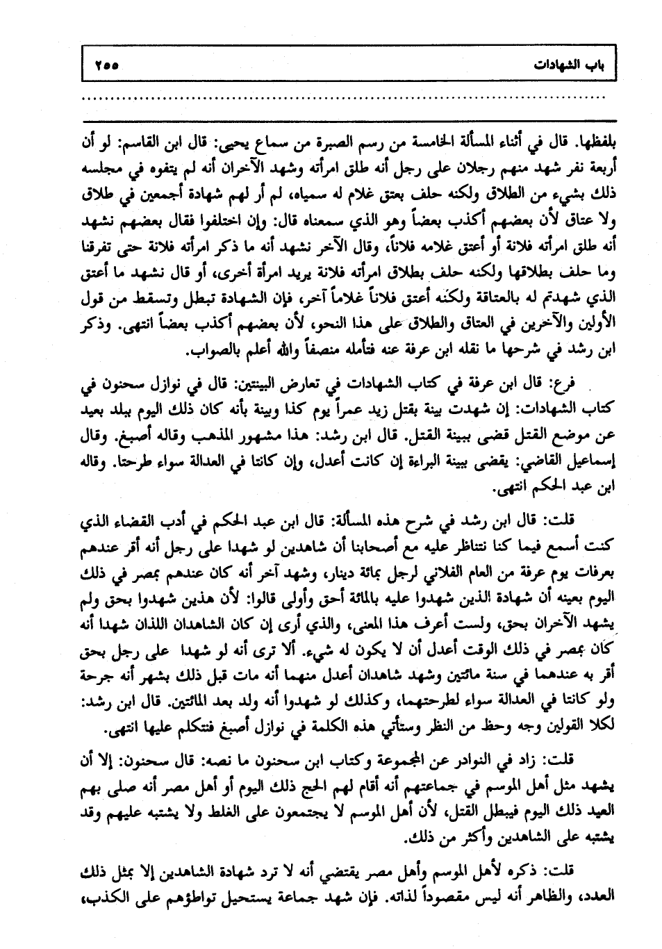 بلفظها. قال في أثناء المسألة الخامسة من رسم الصبرة من سماع يحيى: قال ابن القاسم: لو أن أربعة نفر شهد منهم رجلان على رجل أنه طلق امرأته وشهد الآخران أنه لم يتفوه في مجلسه ذلك بشيء من الطلاق ولكنه حلف بعتق غلام له سمياه لم أر لهم شهادة أجمعين في طلاق ولا عتاق لأن بعضهم أكذب بعضا وهو الذي سمعناه. قال: وإن اختلفوا فقال بعضهم: نشهد أنه طلق امرأته فلانة أو أعتق غلامه فلانا وقال الآخر: نشهد أنه ما ذكر امرأته فلانة حتى تفرقنا وما حلف بطلاقها ولكنه حلف بطلاق امرأته فلانة يريد امرأة أخرى أو قال: نشهد ما أعتق الذي شهدتم له بالعتاقة ولكنه أعتق فلانا غلاما آخر فإن الشهادة تبطل وتسقط من قول الأولين والآخرين في العتاق والطلاق على هذا النحو لأن بعضهم أكذب بعضا انتهى. وذكر ابن رشد في شرحها ما نقله ابن عرفة عنه فتأمله منصفا والله أعلم بالصواب.