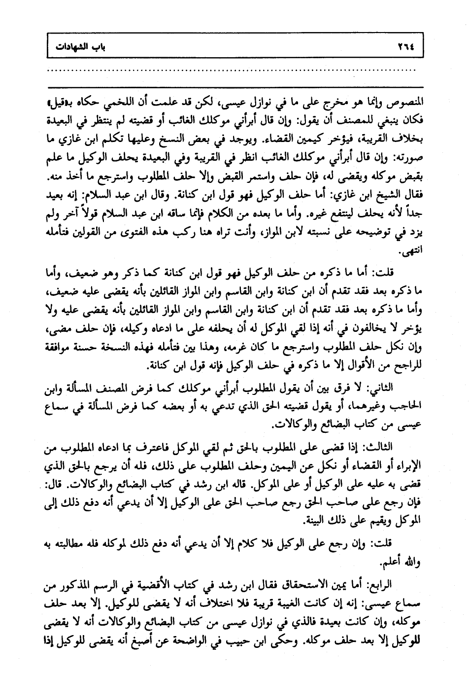 قلت: أما ما ذكره من حلف الوكيل فهو قول ابن كنانة كما ذكر وهو ضعيف. وأما ما ذكره بعد فقد تقدم أن ابن كنانة وابن القاسم وابن المواز القائلين بأنه يقضى عليه، ولا يؤخر لا يخالفون في أنه إذا لقي الموكل له أن يحلفه على ما ادعاه وكيله فإن حلف مضى وإن نكل حلف المطلوب واسترجع ما كان غرمه وهذا بين فتأمله فهذه النسخة حسنة موافقة للراجح من الأقوال إلا ما ذكره في حلف الوكيل فإنه قول ابن كنانة