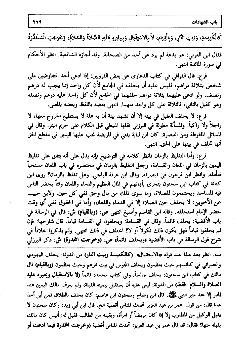 فرع: وأما التغليظ بالزمان فانظر كلامه في التوضيح فإنه يدل على أنه يتفق على تغليظ اليمين بالزمان في اللعان والقسامة وجعل التغليظ بالزمان في مختصره في باب اللعان مستحبا فتأمله وانظر ابن فرحون في تبصرته وقال ابن عرفة الباجي: وهل تغلظ بالزمان؟ روى ابن كنانة في كتاب ابن سحنون يتحرى بأيمانهم في المال العظيم والدماء واللعان وقتا يحضر الناس فيه المساجد ويجتمعون للصلاة وما سوى ذلك من مال وحق ففي كل حين ولابن حبيب عن الأخوين لا يحلف حين الصلاة إلا في الدماء واللعان وأما في الحقوق ففي أي وقت حضر الإمام استحلفه وقاله ابن القاسم وأصبغ انتهى. ص: (وبالقيام) ش: قال في الرسالة في باب الأقضية: يحلف قائما وقال في القسامة: ويحلفون في القسامة قياما قال شارحها: فإن لم يحلفوا قياما فهل يكون ذلك نكولا أو لا؟ اختلف في ذلك انتهى. ولم يذكروا خلافا في شرح قول الرسالة في باب الأقضية: "ويحلف قائما" ص: (وخرجت المخدرة) ش: ذكر البرزلي