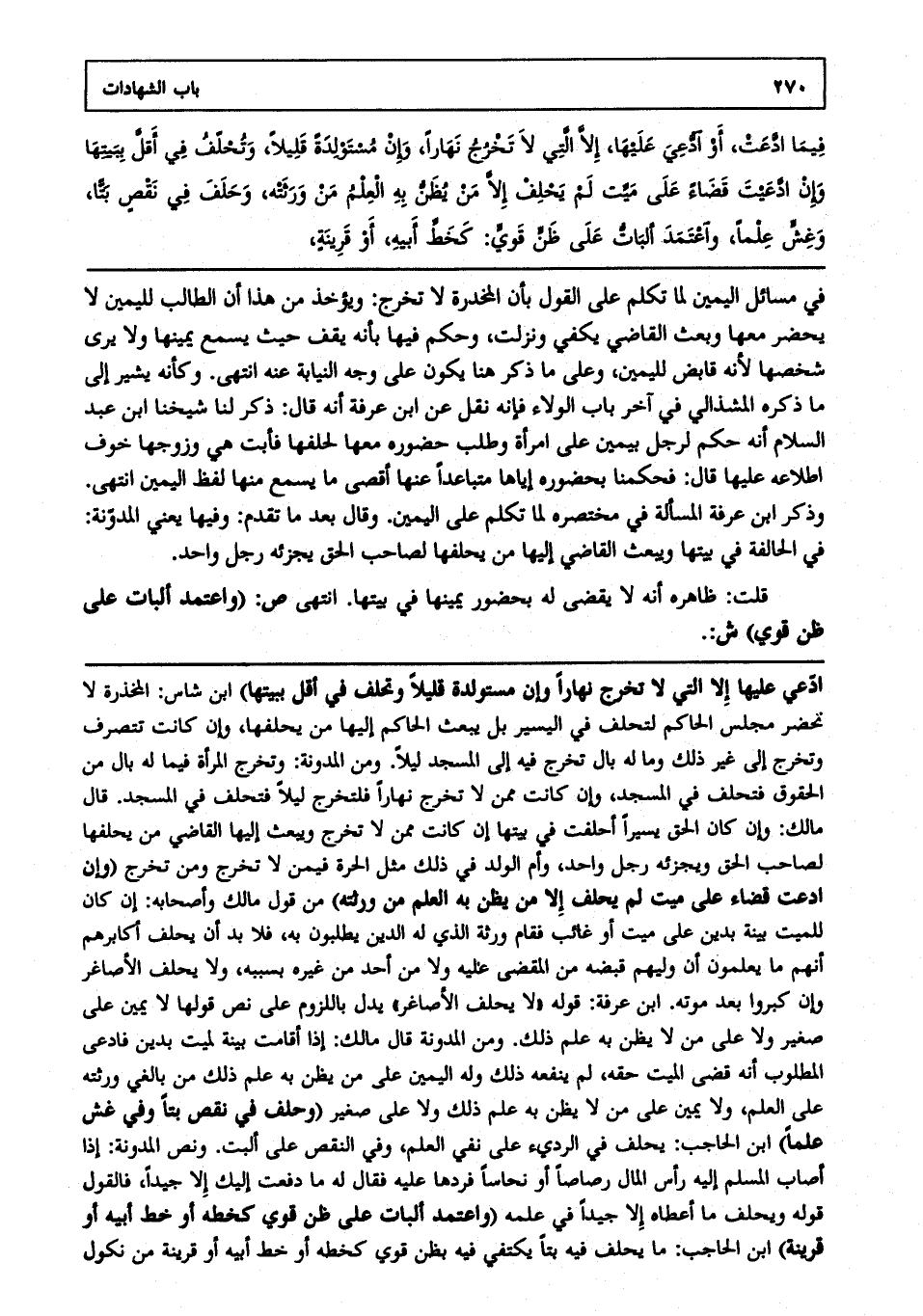 فيما ادعت أو دعي عليها إلا التي لا تخرج نهاراً، وإن مستولدة قليلاً وتحلف في أقل ببيتها، وإن ادعيت قضاء على ميت لم يحلف، إلا من يظن به العلم من ورثته، وحلف في نقص بتاً وغش علماً واعتمد البات على ظن قوي بخط أبيه أو قرينه