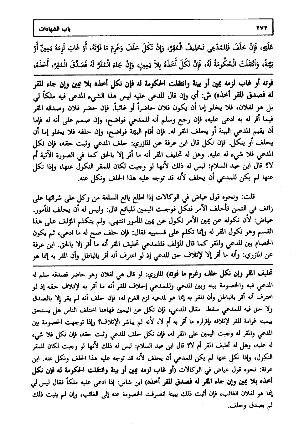 قلت: ونحوه قول عياض في الوكالات: إذا أطلع بائع السلعة من وكل على شرائها على زائف في الثمن فأحلف الآمر فنكل فوجبت اليمين للبائع. قال: وليس له أن يحلف المأمور. عياض: لأن نكوله عن يمين الآمر نكول عن يمين المأمور انتهى. ولم يتكلم المؤلف على هذا القسم وهو نكول المقر له وإنما تكلم على قسيميه فقال: فإن حلف صح له ما ادعى ثم يكون الخصام بين المدعي والمقر كما قال المؤلف: فللمدعي تحليف المقر أنه ما أقر إلا بالحق. ابن عرفة عن المازري: وأنه ما أقر إلا لإتلاف حق المدعي إذ لو اعترف أنه أقر بالباطل وأن المقر به إنما هو