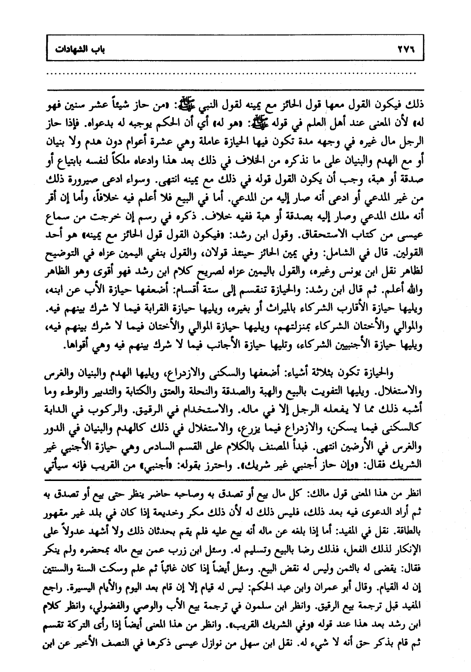ذلك فيكون القول معها قول الحائز مع يمينه؛ لقول النبي صلى الله عليه وسلم: "من حاز شيئا عشر سنين فهو له" لأن المعنى عند أهل العلم في قوله: صلى الله عليه وسلم "هو له" أي أن الحكم يوجبه له بدعواه فإذا حاز الرجل مال غيره في وجهه مدة تكون فيها الحيازة عاملة وهي عشرة أعوام دون هدم ولا بنيان أو مع الهدم والبنيان على ما نذكره من الخلاف في ذلك بعد هذا وادعاه ملكا لنفسه بابتياع أو صدقة أو هبة وجب أن يكون القول قوله في ذلك مع يمينه انتهى. وسواء ادعى صيرورة ذلك من غير المدعي أو ادعى أنه صار إليه من المدعي أما في البيع فلا أعلم فيه خلافا وأما إن أقر أنه ملك المدعي وصار إليه بصدقة أو هبة ففيه خلاف ذكره في رسم إن خرجت من سماع عيسى من كتاب الاستحقاق. وقول ابن رشد: فيكون القول قول الحائز مع يمينه هو أحد القولين قال في الشامل: وفي يمين الحائز حينئذ قولان والقول بنفي اليمين عزاه في التوضيح لظاهر نقل ابن يونس وغيره والقول باليمين عزاه لصريح كلام ابن رشد فهو أقوى وهو الظاهر والله أعلم. ثم قال ابن رشد: والحيازة تنقسم إلى ستة أقسام أضعفها حيازة الأب عن ابنه ويليها حيازة الأقارب الشركاء بالميراث أو بغيره ويليها حيازة القرابة فيما لا شرك بينهم فيه والموالي والأختان الشركاء بمنزلتهم ويليها حيازة الموالي والأختان فيما لا شرك بينهم فيه ويليها حيازة الأجنبيين الشركاء وتليها حيازة الأجانب فيما لا شرك بينهم فيه وهي أقواها. والحيازة تكون بثلاثة أشياء أضعفها والسكنى والازدراع ويليها الهدم والبنيان والغرس والاستغلال ويليها التفويت بالبيع والهبة والصدقة والنحلة والعتق والكتابة والتدبير والوطء وما أشبه ذلك مما لا يفعله الرجل إلا في ماله والاستخدام في الرقيق والركوب في الدابة كالسكنى فيما يسكن والازدراع فيما يزرع والاستغلال في ذلك كالهدم والبنيان في الدور والغرس في الأرضين انتهى. فبدأ المصنف بالكلام على القسم السادس وهي حيازة الأجنبي غير الشريك فقال: وإن حاز أجنبي غير شريك. واحترز بقوله: "أجنبي" من القريب فإنه سيأتي