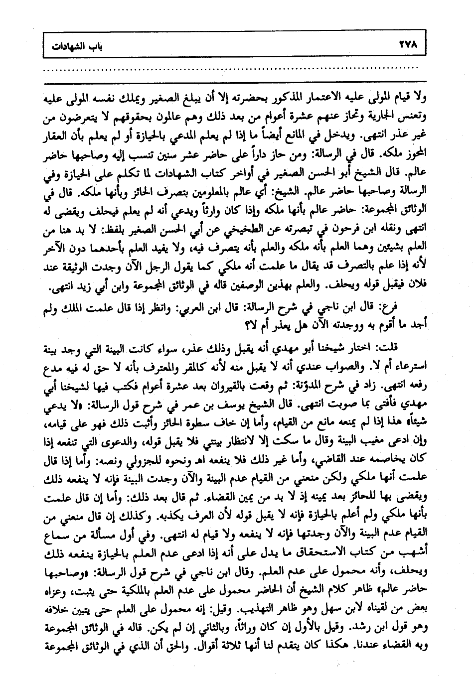 ولا قيام المولى عليه الاعتمار المذكور بحضرته إلا أن يبلغ الصغير ويملك نفسه المولى عليه وتعنس الجارية وتحاز عنهم عشرة أعوام من بعد ذلك وهم عالمون بحقوقهم لا يتعرضون من غير عذر انتهى. ويدخل في المانع أيضا ما إذا لم يعلم المدعي بالحيازة أو لم يعلم بأن العقار المحوز ملكه قال في الرسالة ومن حاز دارا على حاضر عشر سنين تنسب إليه وصاحبها حاضر عالم قال الشيخ أبو الحسن الصغير في أواخر كتاب الشهادات لما تكلم على الحيازة وفي الرسالة: وصاحبها حاضر عالم. الشيخ: أي عالم بالمعلومين بتصرف الحائز وبأنها ملكه قال في الوثائق المجموعة: حاضر عالم بأنها ملكه وإذا كان وارثا ويدعي أنه لم يعلم فيحلف ويقضى له انتهى. ونقله ابن فرحون في تبصرته عن الطخيخي عن أبي الحسن الصغير بلفظ لا بد هنا من العلم بشيئين وهما العلم بأنه ملكه والعلم بأنه يتصرف فيه ولا يفيد العلم بأحدهما دون الآخر لأنه إذا علم بالتصرف قد يقال ما علمت أنه ملكي كما يقول الرجل الآن وجدت الوثيقة عند فلان فيقبل قوله ويحلف والعلم بهذين الوصفين قاله في الوثائق المجموعة وابن أبي زيد انتهى.