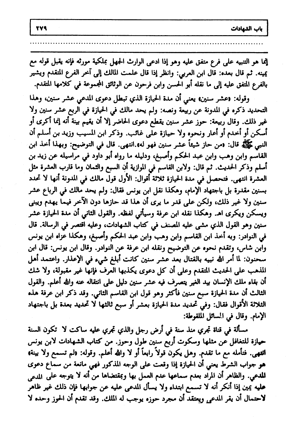 والقول الثالث: أن مدة الحيازة سبع سنين فأكثر وهو قول ابن القاسم الثاني وقد ذكر ابن عرفة هذه الثلاثة الأقوال فقال: وفي تحديد مدة الحيازة بعشر أو سبع ثالثها لا تحديد بعدة بل باجتهاد الإمام وقال في المسائل الملقوطة: