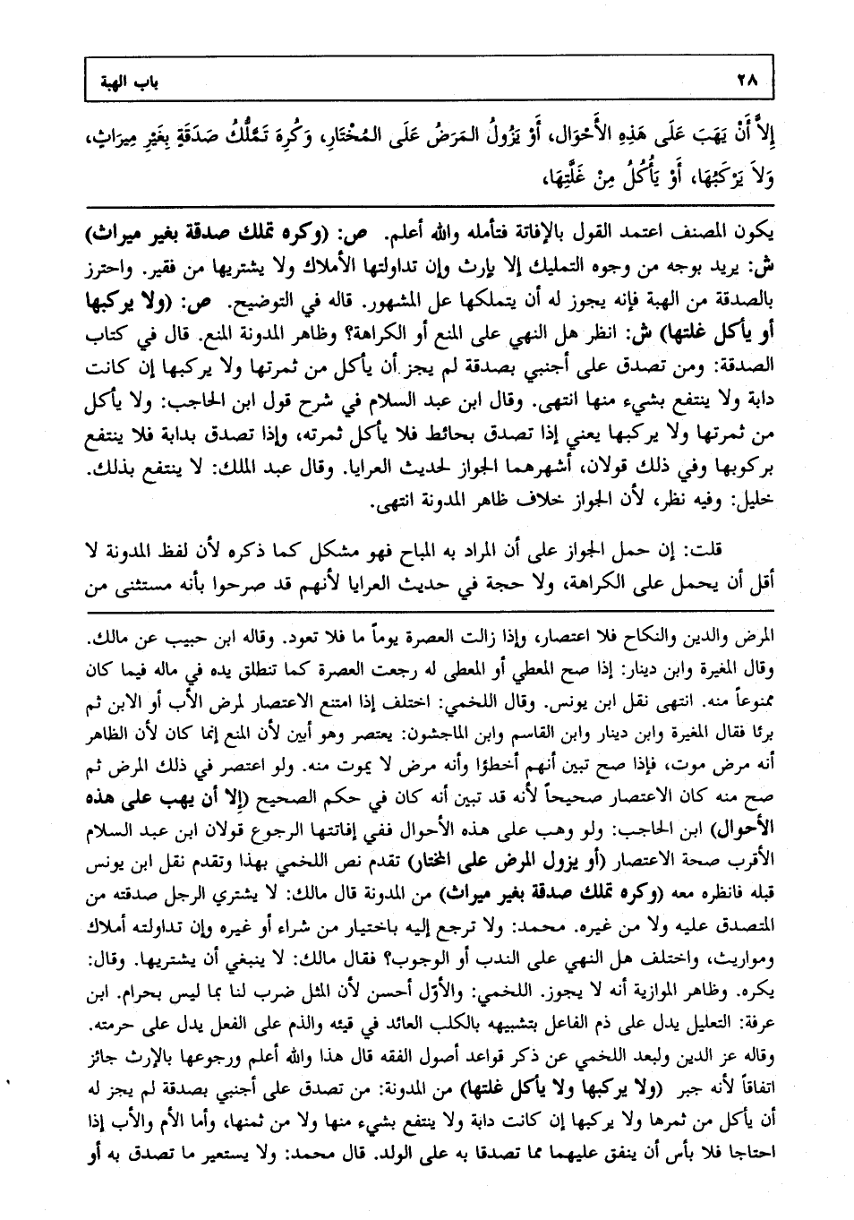ص: (وَكُرِهَ تَمْلِيكُ صَدَقَةٍ بِغَيْرِ مِيرَاثٍ) ش: يُرِيدُ بِوَجْهٍ مِنْ وُجُوهِ التَّمْلِيكِ إلَّا بِإِرْثٍ وَإِنْ تَدَاوَلَتْهَا الْأَمْلَاكُ وَلَا يَشْتَرِيهَا مِنْ فَقِيرٍ، وَاحْتُرِزَ بِالصَّدَقَةِ مِنْ الْهِبَةِ فَإِنَّهُ يَجُوزُ لَهُ أَنْ يَتَمَلَّكَهَا عَلَى الْمَشْهُورِ، قَالَهُ فِي التَّوْضِيحِ. ص: (وَلَا يَرْكَبُهَا أَوْ يَأْكُلُ غَلَّتَهَا) ش: اُنْظُرْ هَلْ النَّهْيُ عَلَى الْمَنْعِ أَوْ الْكَرَاهَةِ، وَظَاهِرُ الْمُدَوَّنَةِ الْمَنْعُ، قَالَ فِي كِتَابِ الصَّدَقَةِ: وَمَنْ تَصَدَّقَ عَلَى أَجْنَبِيٍّ بِصَدَقَةٍ لَمْ يَجُزْ أَنْ يَأْكُلَ مِنْ ثَمَرَتِهَا وَلَا يَرْكَبَهَا إنْ كَانَتْ دَابَّةً وَلَا يَنْتَفِعَ بِشَيْءٍ مِنْهَا، انْتَهَى. وَقَالَ ابْنُ عَبْدِ السَّلَامِ فِي شَرْحِ قَوْلِ ابْنِ الْحَاجِبِ: وَلَا يَأْكُلُ مِنْ ثَمَرَتِهَا وَلَا يَرْكَبُهَا يَعْنِي إذَا تَصَدَّقَ بِحَائِطٍ فَلَا يَأْكُلُ ثَمَرَتَهُ وَإِذَا تَصَدَّقَ بِدَابَّةٍ فَلَا يَنْتَفِعُ بِرُكُوبِهَا وَفِي ذَلِكَ قَوْلَانِ أَشْهَرُهُمَا الْجَوَازُ لِحَدِيثِ الْعَرَايَا وَقَالَ عَبْدُ الْمَلِكِ: لَا يَنْتَفِعُ بِذَلِكَ خَلِيلٌ وَفِيهِ نَظَرٌ؛ لِأَنَّ الْجَوَازَ خِلَافُ ظَاهِرِ الْمُدَوَّنَةِ، انْتَهَى. قلت: إنْ حُمِلَ الْجَوَازُ عَلَى أَنَّ الْمُرَادَ بِهِ الْمُبَاحُ فَهُوَ مُشْكِلٌ كَمَا ذَكَرَهُ؛ لِأَنَّ لَفْظَ الْمُدَوَّنَةِ لَا أَقَلَّ أَنْ يُحْمَلَ عَلَى الْكَرَاهَةِ وَلَا حُجَّةَ فِي حَدِيثِ الْعَرَايَا؛ لِأَنَّهُمْ قَدْ صَرَّحُوا بِأَنَّهُ مُسْتَثْنًى مِنْ