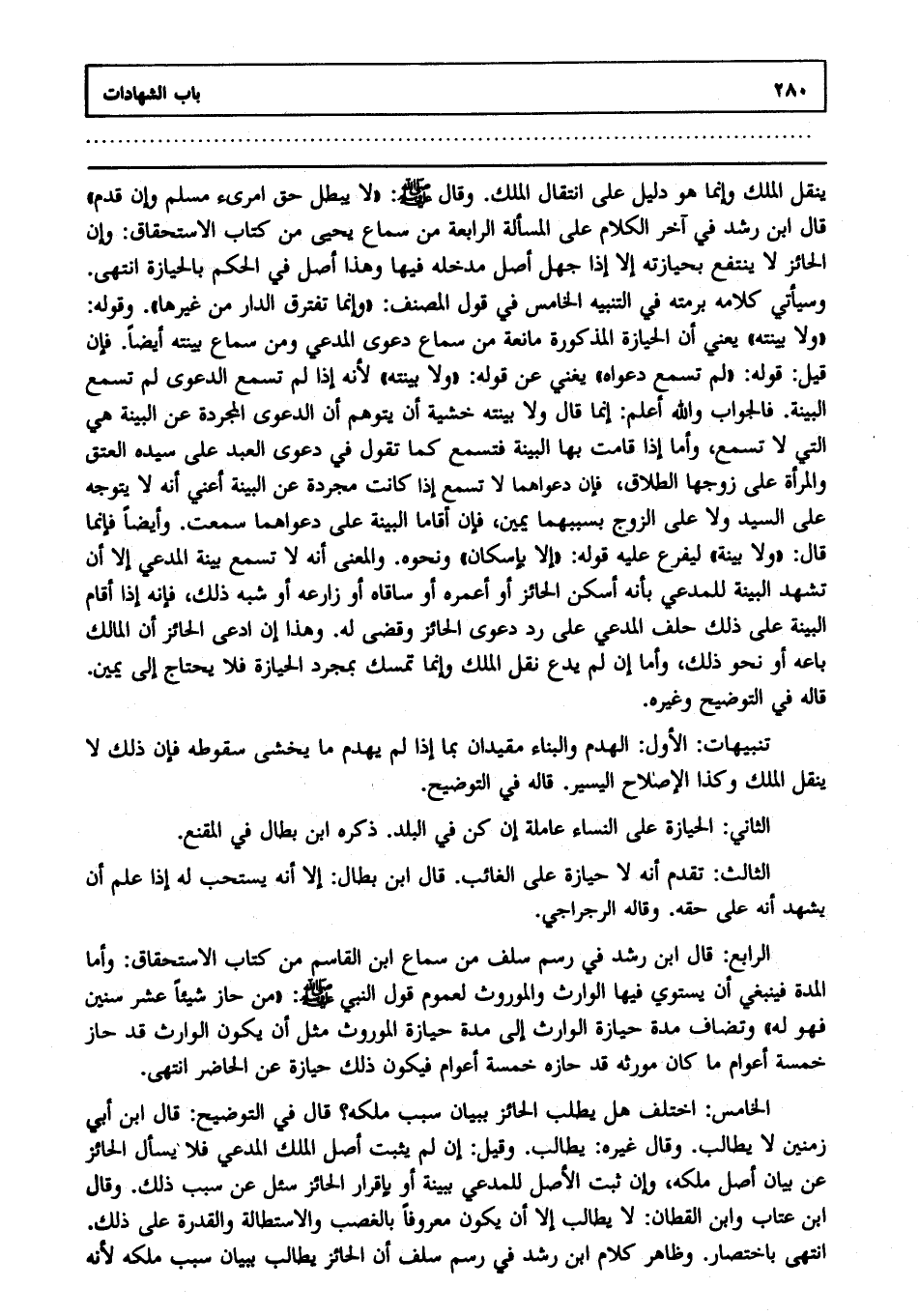 الرابع: قال ابن رشد في رسم سلف من سماع ابن القاسم من كتاب الاستحقاق: وأما المدة فينبغي أن يستوي فيها الوارث والموروث لعموم قول النبي صلى الله عليه وسلم: "من حاز شيئا عشر سنين فهو له" وتضاف مدة حيازة الوارث إلى مدة حيازة الموروث مثل أن يكون الوارث قد حاز خمسة أعوام ما كان مورثه قد حازه خمسة أعوام فيكون ذلك حيازة عن الحاضر انتهى.