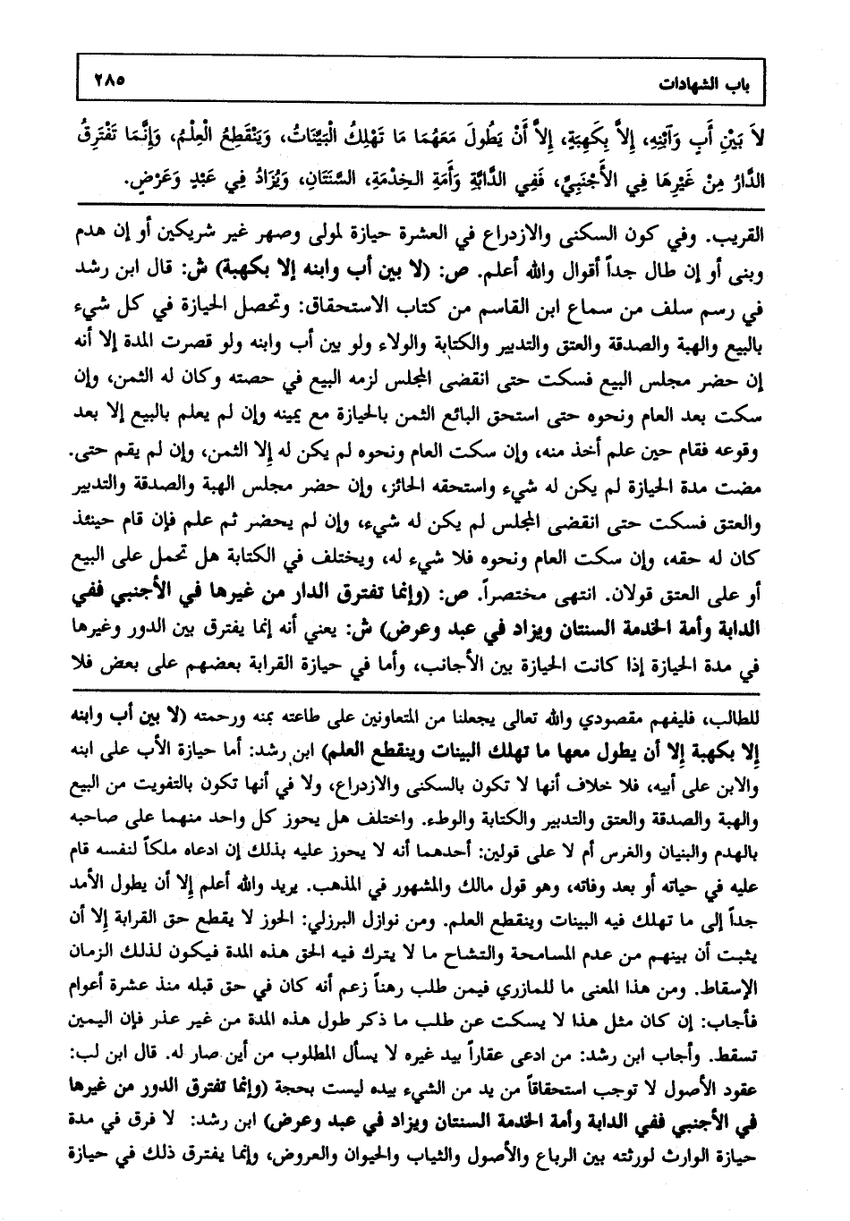 القريب وفي كون السكنى والازدراع في العشرة حيازة لمولى وصهر غير شريكين أو إن هدم وبنى أو إن طال جدا أقوال والله أعلم. ص: (لا بين أب وابنه إلا بكهبة) ش: قال ابن رشد في رسم سلف من سماع ابن القاسم من كتاب الاستحقاق: وتحصل الحيازة في كل شيء بالبيع والهبة والصدقة والعتق والتدبير والكتابة والولاء ولو بين أب وابنه، ولو قصرت المدة إلا أنه إن حضر مجلس البيع فسكت حتى انقضى المجلس لزمه البيع في حصته وكان له الثمن وإن سكت بعد العام ونحوه حتى استحق البائع الثمن بالحيازة مع يمينه وإن لم يعلم بالبيع إلا بعد وقوعه فقام حين علم أخذ منه وإن سكت العام ونحوه لم يكن له إلا الثمن وإن لم يقم حتى مضت مدة الحيازة لم يكن له شيء واستحقه الحائز وإن حضر مجلس الهبة والصدقة والتدبير والعتق فسكت حتى انقضى المجلس لم يكن له شيء. وإن لم يحضر ثم علم فإن قام حينئذ كان له حقه وإن سكت العام ونحوه فلا شيء له ويختلف في الكتابة هل تحمل على البيع أو على العتق؟ قولان انتهى مختصرا. ص: (وإنما تفترق الدار من غيرها في الأجنبي ففي الدابة وأمة الخدمة السنتان ويزاد في عبد وعرض) ش: يعني أنه إنما يفترق بين الدور وغيرها في مدة الحيازة إذا كانت الحيازة بين الأجانب وأما في حيازة القرابة بعضهم على بعض فلا