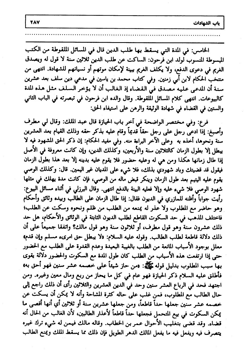 الخامس: في المدة التي يسقط بها طلب الدين قال في المسائل الملقوطة من الكتب المبسوطة المنسوب لوالد ابن فرحون: الساكت عن طلب الدين ثلاثين سنة لا قول له ويصدق الغريم في دعوى الدفع ولا يكلف الغريم ببينة لإمكان موتهم أو نسيانهم للشهادة انتهى من منتخب الحكام لابن أبي زمنين وفي كتاب محمد بن ياسين في مدعي دين سلف بعد عشرين سنة أن المدعى عليه مصدق في القضاء إذ الغالب أن لا يؤخر السلف مثل هذه المدة كالبيوعات انتهى كلام المسائل الملقوطة. وقال والده ابن فرحون في تبصرته في الباب الثاني والستين في القضاء في شهادة الوثيقة والرهن على استيفاء الحق: