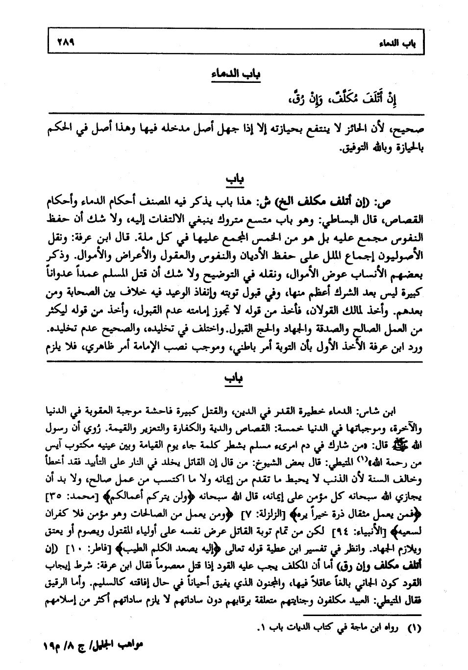 ص: (إنْ أَتْلَفَ مُكَلَّفٌ إلَخْ) ش: هَذَا بَابٌ يَذْكُرُ فِيهِ الْمُصَنِّفُ أَحْكَامَ الدِّمَاءِ وَأَحْكَامَ الْقِصَاص قَالَ الْبِسَاطِيُّ: وَهُوَ بَابٌ مُتَّسِعٌ مَتْرُوكٌ يَنْبَغِي الِالْتِفَاتُ إلَيْهِ، وَلَا شَكَّ أَنَّ حِفْظَ النُّفُوسِ مُجْمَعٌ عَلَيْه،ِ بَلْ هُوَ مِنْ الْخَمْسِ الْمُجْمَعِ عَلَيْهَا فِي كُلِّ مِلَّةٍ، قَالَ ابْنُ عَرَفَةَ: وَنَقَلَ الْأُصُولِيُّونَ إجْمَاعَ الْمِلَلِ عَلَى حِفْظِ الْأَدْيَانِ وَالنُّفُوسِ وَالْعُقُولِ وَالْأَعْرَاضِ وَالْأَمْوَالِ، وَذَكَرَ بَعْضُهُمْ الْأَنْسَابَ عِوَضَ الْأَمْوَالِ وَنَقَلَهُ فِي التَّوْضِيحِ وَلَا شَكَّ أَنَّ قَتْلَ الْمُسْلِمِ عَمْدًا عُدْوَانًا كَبِيرَةٌ لَيْسَ بَعْدَ الشِّرْكِ أَعْظَمُ مِنْهَا، وَفِي قَبُولِ تَوْبَتِهِ وَإِنْفَاذِ الْوَعِيدِ فِيهِ خِلَافٌ بَيْنَ الصَّحَابَةِ وَمَنْ بَعْدَهُمْ، وَأُخِذَ لِمَالِكٍ الْقَوْلَانِ فَأُخِذَ مِنْ قَوْلِهِ: "لَا تَجُوزُ إمَامَتُهُ". عَدَمُ الْقَبُولِ. وَأُخِذَ مِنْ قَوْلِهِ: "لِيُكْثِرَ مِنْ الْعَمَلِ الصَّالِحِ وَالصَّدَقَةِ وَالْجِهَادِ وَالْحَجِّ". الْقَبُولُ. وَاخْتُلِفَ فِي تَخْلِيدِهِ، وَالصَّحِيحُ عَدَمُ تَخْلِيدِهِ، وَرَدَّ ابْنُ عَرَفَةَ الْأَخْذَ الْأَوَّلَ بِأَنَّ التَّوْبَةَ أَمْرٌ بَاطِنِيٌّ وَمُوجِبُ نَصْبِ الْإِمَامَةِ أَمْرٌ ظَاهِرِيٌّ فَلَا يَلْزَمُ
