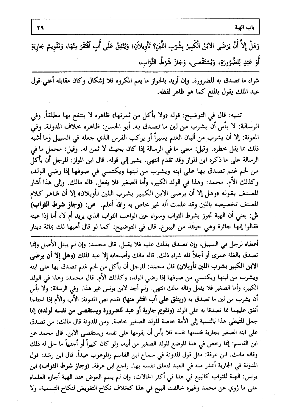 تنبيه: قَالَ فِي التَّوْضِيحِ: قَوْلُهُ: "وَلَا يَأْكُلُ مِنْ ثَمَرَتِهَا" ظَاهِرُهُ لَا يَنْتَفِعُ بِهَا مُطْلَقًا وَفِي الرِّسَالَةِ: لَا بَأْسَ أَنْ يَشْرَبَ مِنْ لَبَنِ مَا تَصَدَّقَ بِهِ. أَبُو الْحَسَنِ: ظَاهِرُهُ خِلَافُ الْمُدَوَّنَةِ وَفِي الْمَعُونَةِ: إلَّا أَنْ يَشْرَبَ مِنْ أَلْبَانِ الْغَنَمِ يَسِيرًا، أَوْ يَرْكَبَ الْفَرَسَ الَّذِي جَعَلَهُ فِي السَّبِيلِ وَمَا أَشْبَهَ ذَلِكَ مِمَّا يَقِلُّ خَطَرُهُ، وَقِيلَ: مَعْنَى مَا فِي الرِّسَالَةِ إذَا كَانَ بِحَيْثُ لَا ثَمَنَ لَهُ، وَقِيلَ: مَحْمَلُ مَا فِي الرِّسَالَةِ عَلَى مَا ذَكَرَهُ ابْنُ الْمَوَّازِ وَقَدْ تَقَدَّمَ، انْتَهَى. يُشِيرُ إلَى قَوْلِهِ: قَالَ ابْنُ الْمَوَّازِ: لِلرَّجُلِ أَنْ يَأْكُلَ مِنْ لَحْمِ غَنَمٍ تَصَدَّقَ بِهَا عَلَى ابْنِهِ وَيَشْرَبَ مِنْ لَبَنِهَا وَيَكْتَسِيَ فِي صُوفِهَا إذَا رَضِيَ الْوَلَدُ وَكَذَلِكَ الْأُمُّ. مُحَمَّدٌ: وَهَذَا فِي الْوَلَدِ الْكَبِيرِ وَأَمَّا الصَّغِيرُ فَلَا يَفْعَلُ، قَالَهُ مَالِكٌ، وَإِلَى هَذَا أَشَارَ الْمُصَنِّفُ بِقَوْلِهِ: "وَهَلْ إلَّا أَنْ يَرْضَى الِابْنُ الْكَبِيرُ بِشُرْبِ اللَّبَنِ تَأْوِيلَانِ" إلَّا أَنَّ ظَاهِرَ كَلَامِ الْمُصَنِّفِ تَخْصِيصُهُ بِاللَّبَنِ وَقَدْ عَلِمْت أَنَّهُ غَيْرُ خَاص بِهِ، وَاَللَّهُ أَعْلَمُ.