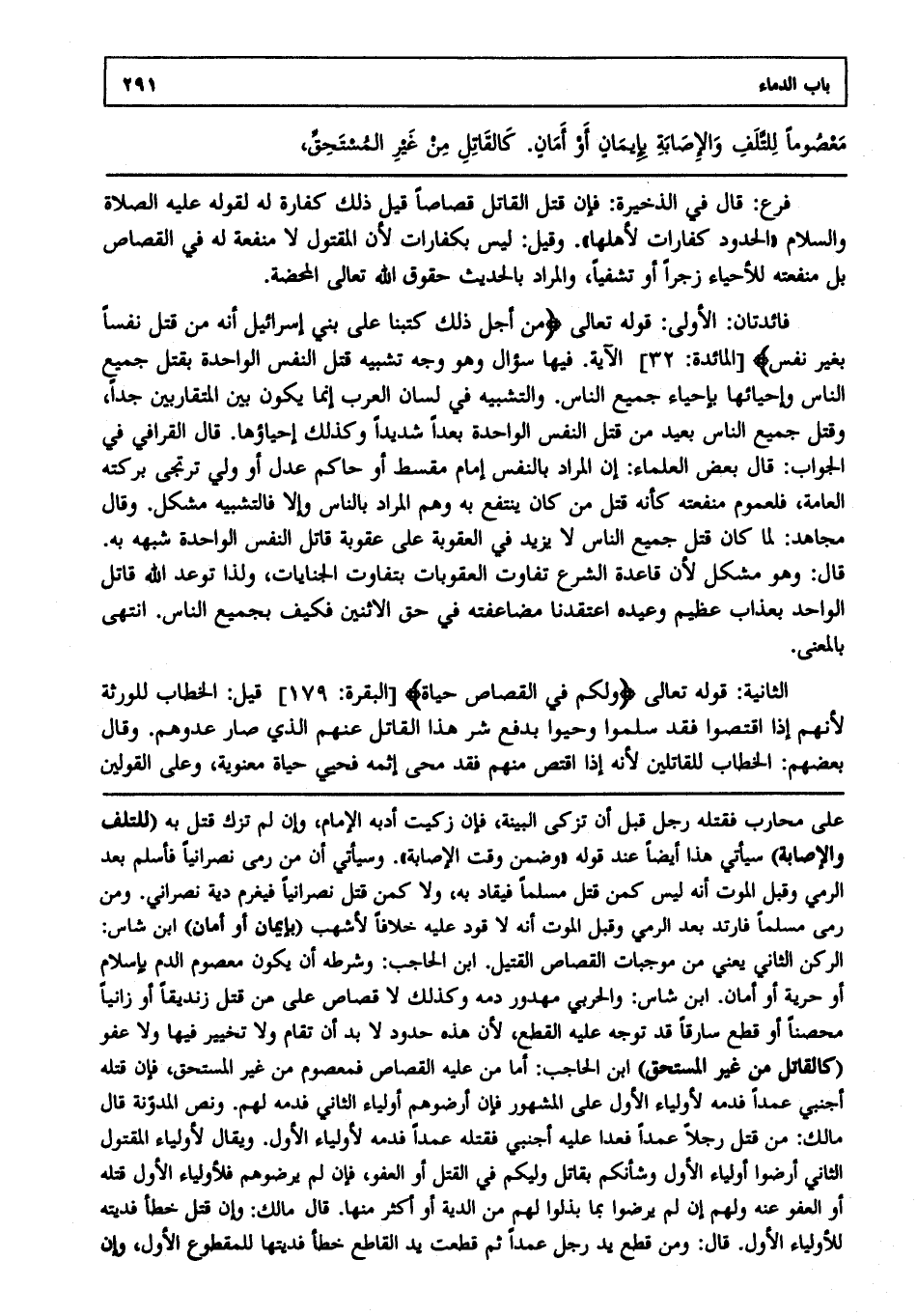 فرع: قال في الذخيرة: فإن قتل القاتل قصاصا قيل: ذلك كفارة له لقوله عليه الصلاة والسلام: "الحدود كفارات لأهلها" وقيل: ليس بكفارات؛ لأن المقتول لا منفعة له في القصاص بل منفعته للأحياء زجرا أو تشفيا والمراد بالحديث حقوق الله تعالى المحضة. فائدتان: الأولى: قوله تعالى: {مِنْ أَجْلِ ذَلِكَ كَتَبْنَا عَلَى بَنِي إِسْرائيلَ أَنَّهُ مَنْ قَتَلَ نَفْساً بِغَيْرِ نَفْسٍ } الآية. [المائدة: من الآية32] فيها سؤال وهو وجه تشبيه قتل النفس الواحدة بقتل جميع الناس وإحيائها بإحياء جميع الناس؟ والتشبيه في لسان العرب إنما يكون بين المتقاربين جدا وقتل جميع الناس بعيد من قتل النفس الواحدة بعدا شديدا وكذلك إحياؤها قال القرافي في الجواب: قال بعض العلماء: إن المراد بالنفس إمام مقسط أو حاكم عدل أو ولي ترتجى بركته العامة فلعموم منفعته كأنه قتل من كان ينتفع به وهم المراد بالناس وإلا فالتشبيه مشكل وقال مجاهد: لما كان قتل جميع الناس لا يزيد في العقوبة على عقوبة قاتل النفس الواحدة شبهه به. قال: وهو مشكل؛ لأن قاعدة الشرع تفاوت العقوبات بتفاوت الجنايات؛ ولذا توعد الله قاتل الواحد بعذاب عظيم وعيده، اعتقدنا مضاعفته في حق الاثنين فكيف بجميع الناس انتهى بالمعنى. الثانية: قوله تعالى: {وَلَكُمْ فِي الْقِصَاصِ حَيَاةٌ} [البقرة: من الآية179] قيل: الخطاب للورثة؛ لأنهم إذا اقتصوا فقد سلموا وحيوا بدفع شر هذا القاتل عنهم الذي صار عدوهم وقال بعضهم: الخطاب للقاتلين؛ لأنه إذا اقتص منهم فقد محي إثمه فحيي حياة معنوية. وعلى القولين