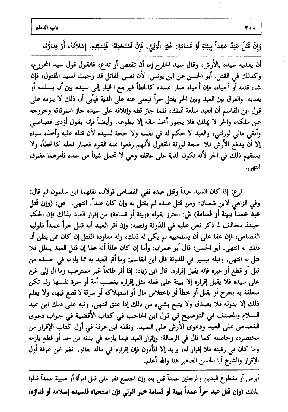 ص: (وإن قتل عبد عمدا ببينة أو قسامة) ش: احترز بقوله ببينة أو قسامة من إقرار العبد بذلك فإن الحكم حينئذ مخالف لما ذكر نص عليه في المدونة ونصه. وإن أقر العبد أنه قتل حرا عمدا فلوليه القصاص فإن عفا على أن يستحييه لم يكن له ذلك وله معاودة القتل إن كان ممن يظن أن ذلك له انتهى. أبو الحسن قال أبو عمران: وأما إن كان عالما أنه عفا إن قتل العبد يبطل فلا قتل له انتهى. وقبله بيسير في المدونة قال ابن القاسم وما أقر العبد به مما يلزمه في جسده من قتل أو قطع أو غيره فإنه يقبل إقراره. قال ابن زياد: إذا أقر طائعا غير مسترهب وما آل إلى غرم على سيده فلا يقبل إقراره إلا ببينة على فعله مثل إقراره بغصب أمة أو حرة نفسها ولم تكن متعلقة به بجرح أو بقتل أو خطإ أو باختلاس مال أو استهلاكه أو سرقة لا قطع فيها ولا يعلم ذلك إلا بقوله فلا يصدق ولا يتبع بشيء من ذلك إذا عتق انتهى. ونبه على ذلك ابن عبد السلام والمصنف في التوضيح في قول ابن الحاجب في كتاب الأقضية في جواب دعوى القصاص على العبد ودعوى الأرش على السيد ونقله ابن عرفة في أول كتاب الإقرار من مختصره وحاصله كما قال في الرسالة وإقرار العبد فيما يلزمه في بدنه من حد أو قطع يلزمه وما كان في رقبته فلا إقرار له يريد إلا المأذون فإن إقراره في ماله جائز انظر ابن عرفة أول الإقرار والشيخ أبا الحسن الصغير هنا والله أعلم.