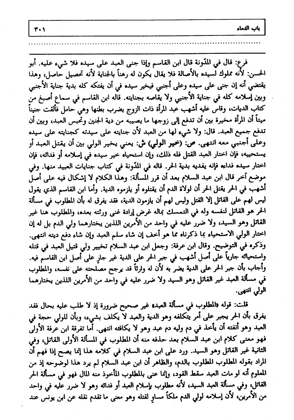 قلت: قوله: "المطلوب في مسألة العبد" غير صحيح ضرورة إذ لا طلب عليه بحال فقد يفرق بأن الحر يجبر على أمر يتكلفه وهو الدية والعبد لا يكلف بشيء وبأن للولي حجة في العبد وهو أنفته أن يأخذ في دم وليه دم عبد وهو لا يكافئه انتهى. أما تفرقة ابن عرفة الأولى فهو معنى كلام ابن عبد السلام بعد حذفه منه أن المطلوب في المسألة الأولى القاتل وفي الثانية غير القاتل وهو السيد ورد على ابن عبد السلام في كلامه هذا إنما يصح إذا فهم أن المراد بقوله (المطلوب) المطلوب بالدم والظاهر أن ابن عبد السلام لم يرد هذا لوضوحه إذ من المعلوم أنه لو مات العبد سقط القود وإنما عنى بالمطلوب المأخوذ منه المال فهو في مسألة الحر القاتل وفي مسألة العبد السيد لأنه مطلوب بإسلام العبد أو فدائه وهو لا ضرر عليه في واحد من الأمرين لأن إسلامه لولي الدم ملكا مساو لقتله وهو معنى ما تقدم نقله عن ابن يونس عند