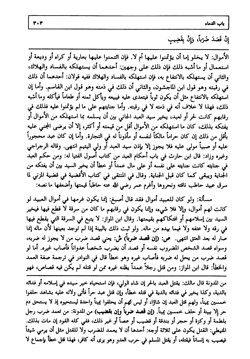 مسألة: وَلَوْ كَانَ لِلْعَبِيدِ أَمْوَالٌ فَقَدْ قَالَ أَصْبَغُ: إنَّمَا يَكُونُ غُرْمُهَا فِي أَمْوَالِ الْعَبِيدِ لَوْ كَانَتْ لَهُمْ أَمْوَالٌ وَإِلَّا فَلَا شَيْءَ وَإِنَّمَا يَكُونُ فِي رِقَابِهِمْ مَا كَانَ مِنْ سَرِقَةٍ لَا قَطْعَ فِيهَا فَيُخَيَّرُ السَّيِّدُ بَيْنَ إسْلَامِهِمْ أَوْ افْتِكَاكِهِمْ بِقِيمَتِهَا وَقَالَ ابْنُ الْمَوَّازِ: لَا يُتْبَعُ فِي السَّرِقَةِ الَّتِي يُقْطَعُ فِيهَا فِي رِقِّهِ وَلَا عِتْقِهِ وَلَا فِيمَا بِيَدِهِ مِنْ مَالِهِ وَلَوْ ثَبَتَ ذَلِكَ بِالْبَيِّنَةِ إذَا لَمْ تُوجَدْ بِعَيْنِهَا لِأَنَّ مَالَهُ إنَّمَا صَارَ لَهُ بَعْدَ الْعِتْقِ انْتَهَى. ص: (إن قصد ضربا) ش: يعني قصد ضرب من لا يجوز له ضربه وسواء قصد الشخص المضروب نفسه أو قصد أن يضرب شخصا عدوانا فأصاب غيره أما لو قصد ضرب من يحل له ضربه فأصاب غيره وهو خطأ قال في النوادر في ترجمة صفة العمد والخطإ: قال ابن المواز: ومن قتل رجلا عمدا يظنه غيره ممن لو قتله لم يكن فيه قصاص فهو