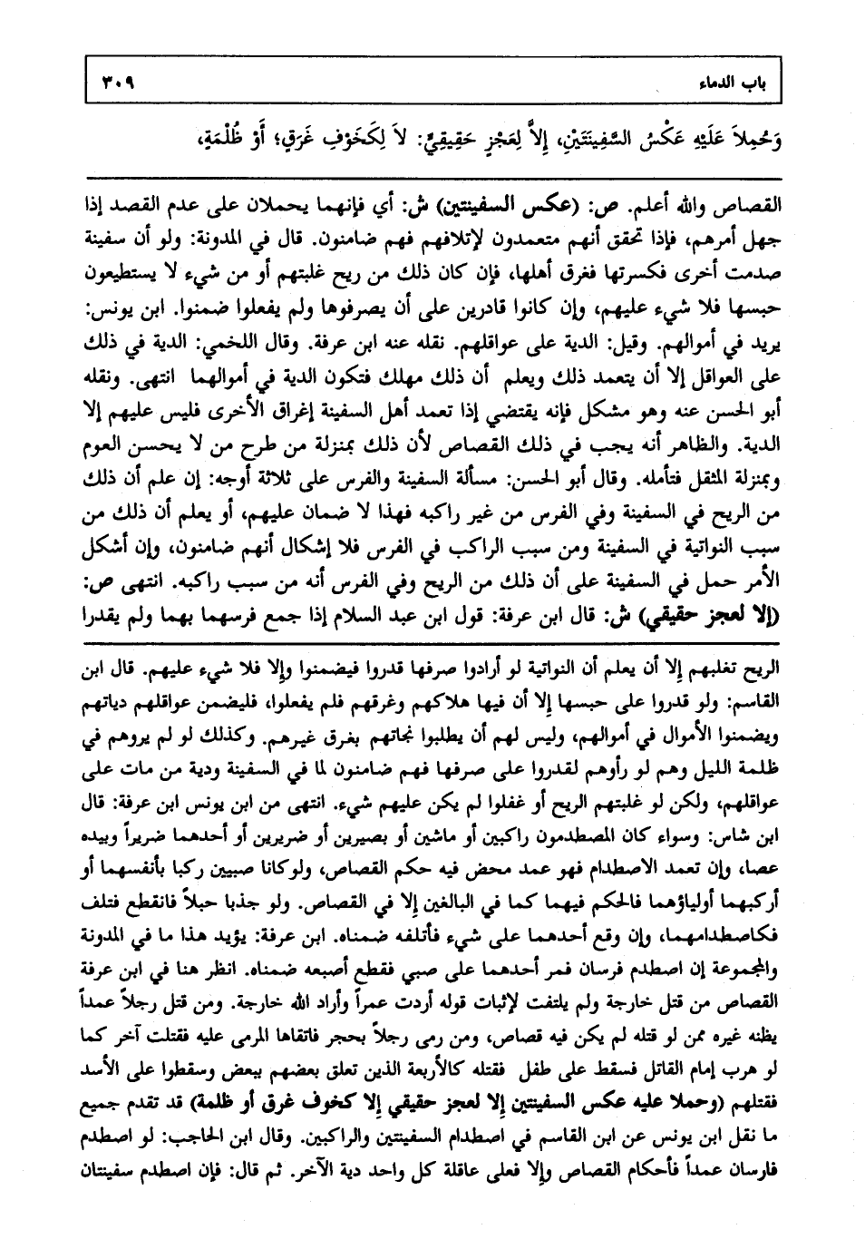 ص: (عكس السفينتين) ش: أي فإنهما يحملان على عدم القصد إذا جهل أمرهم فإذا تحقق أنهم متعمدون لإتلافهم فهم ضامنون. قال في المدونة: ولو أن سفينة صدمت أخرى فكسرتها فغرق أهلها فإن كان ذلك من ريح غلبتهم أو من شيء لا يستطيعون حبسها فلا شيء عليهم وإن كانوا قادرين على أن يصرفوها ولم يفعلوا ضمنوا. ابن يونس: يريد في أموالهم، وقيل: الدية على عواقلهم نقله عنه ابن عرفة وقال اللخمي: الدية في ذلك على العواقل إلا أن يتعمد ذلك ويعلم أن ذلك مهلك فتكون الدية في أموالهما انتهى. ونقله أبو الحسن عنه وهو مشكل فإنه يقتضي إذا تعمد أهل السفينة إغراق الأخرى فليس عليهم إلا الدية والظاهر أنه يجب في ذلك القصاص لأن ذلك بمنزلة من طرح من لا يحسن العوم وبمنزلة المثقل فتأمله وقال أبو الحسن: مسألة السفينة والفرس على ثلاثة أوجه إن علم أن ذلك من الريح في السفينة وفي الفرس من غير راكبه فهذا الإضمان عليهم. أو يعلم أن ذلك من سبب النواتية في السفينة ومن سبب الراكب في الفرس فلا إشكال أنهم ضامنون وإن أشكل الأمر حمل في السفينة على أن ذلك من الريح وفي الفرس أنه من سبب راكبه انتهى. ص: (إلا لعجز حقيقي) ش: قال ابن عرفة: قول ابن عبد السلام: إذا جمح فرسهما بهما ولم يقدرا