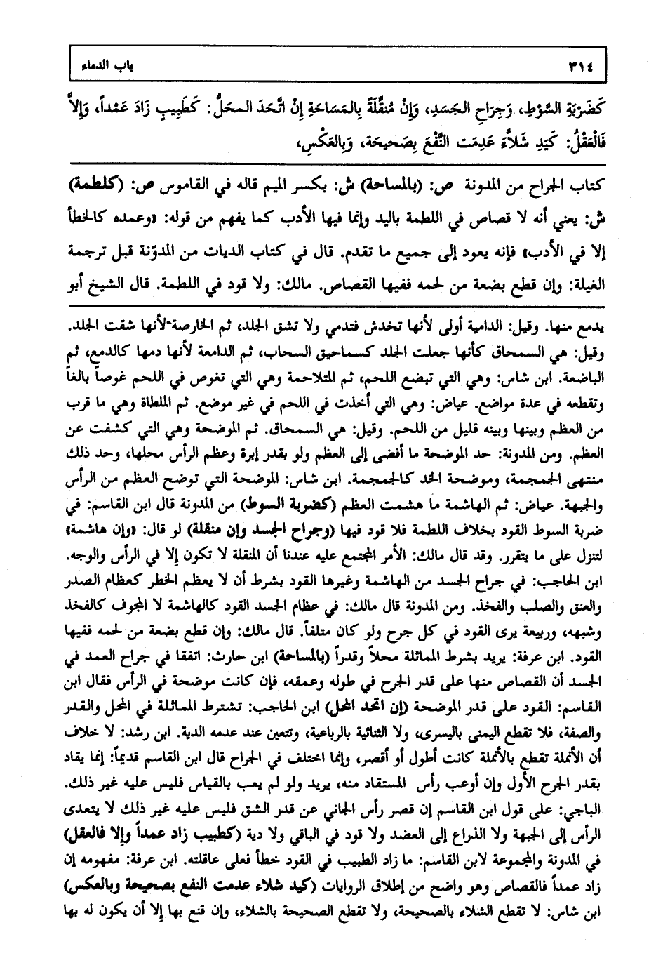 كتاب الجراح من المدونة. ص: (بالمساحة) ش: بكسر الميم قاله في القاموس. ص: (كلطمة) ش: يعني أنه لا قصاص في اللطمة باليد وإنما فيها الأدب كما يفهم من قوله: "وعمده كالخطإ إلا في الأدب" فإنه يعود إلى جميع ما تقدم، قال في كتاب الديات من المدونة قبل ترجمة الغيلة: وإن قطع بضعة من لحمه ففيها القصاص. مالك ولا قود في اللطمة قال الشيخ أبو