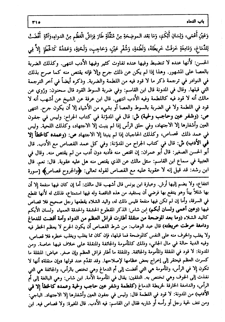 وعين أعمى ولسان أبكم، وما بعد الموضحة من منقلة، طار فراش العظم من الدواء وعامة أفضت للدماغ، ودامغة خرقت خريطته، ولطمة وشفر عين وحاجب ولحية، وعمده كالخطإ إلا في