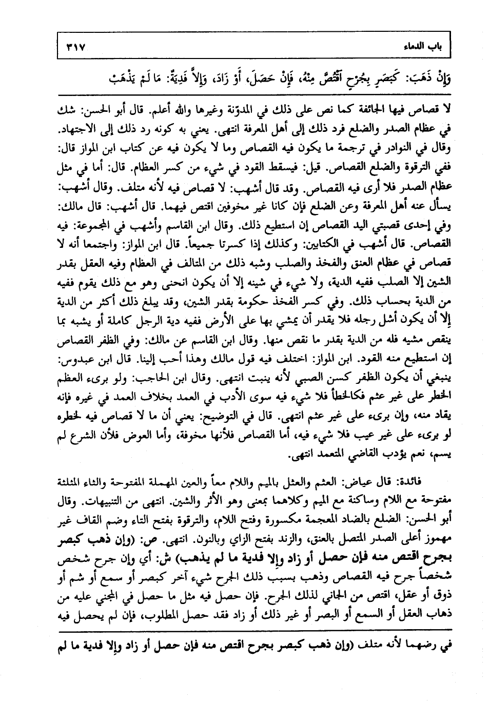 لا قصاص فيها الجائفة كما نص على ذلك في المدونة وغيرها والله أعلم. قال أبو الحسن شك في عظام الصدر والضلع فرد ذلك إلى أهل المعرفة انتهى يعني به كونه رد ذلك إلى الاجتهاد. وقال في النوادر في ترجمة ما يكون فيه القصاص وما لا يكون فيه عن كتاب ابن المواز: قال: ففي الترقوة والضلع القصاص. قيل: فيسقط القود في شيء من كسر العظام قال أما في مثل عظام الصدر فلا أرى فيه القصاص وقد قال أشهب: لا قصاص فيه؛ لأنه متلف وقال أشهب يسأل عنه أهل المعرفة وعن الضلع فإن كانا غير مخوفين اقتص فيهما قال أشهب: قال مالك: وفي إحدى قصبتي اليد القصاص إن استطيع ذلك. وقال ابن القاسم: وأشهب في المجموعة فيه القصاص قال أشهب في الكتابين: وكذلك إذا كسرتا جميعا قال ابن المواز: واجتمعا أنه لا قصاص في عظام العنق والفخذ والصلب وشبه ذلك من المتألف في العظام وفيه العقل بقدر الشين إلا الصلب ففيه الدية ولا شيء في شينه إلا أن يكون انحنى وهو مع ذلك يقوم ففيه من الدية بحساب ذلك وفي كسر الفخذ حكومة بقدر الشين وقد يبلغ ذلك أكثر من الدية إلا أن يكون أشل رجله فلا يقدر أن يمشي بها على الأرض ففيه دية الرجل كاملة أو يشينه بما ينقص مشيه فله من الدية بقدر ما نقص منها وقال ابن القاسم عن مالك: وفي الظفر القصاص إن استطيع منه القود ابن المواز اختلف فيه قول مالك وهذا أحب إلينا قال ابن عبدوس: ينبغي أن يكون الظفر كسن الصبي لأنه ينبت انتهى. وقال ابن الحاجب: ولو برئ العظم الخطر على غير عثم فكالخطإ فلا شيء فيه سوى الأدب في العمد بخلاف العمد في غيره فإنه يقاد منه وإن برئ على غير عثم انتهى. قال في التوضيح: يعني أن ما لا قصاص فيه لخطره لو برئ على غير عيب فلا شيء فيه أما القصاص فلأنها مخوفة وأما العوض فلأن الشرع لم يسم، نعم يؤدب القاضي المتعمد انتهى.