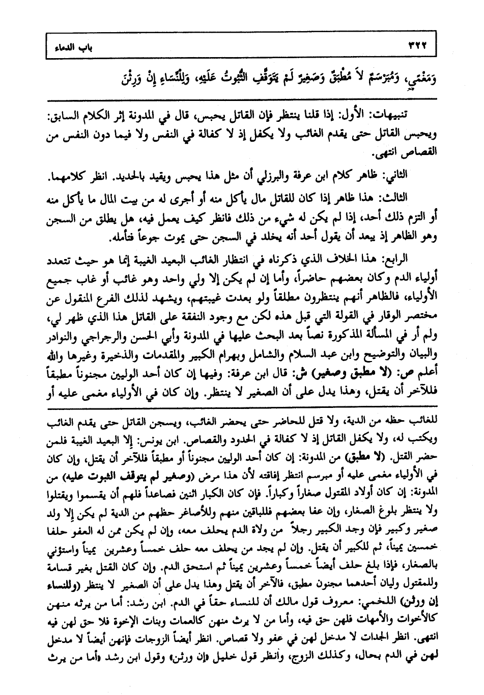 تنبيهات: الأول: إذا قلنا: ينتظر فإن القاتل يحبس قال في المدونة إثر الكلام السابق: ويحبس القاتل حتى يقدم الغائب ولا يكفل إذ لا كفالة في النفس ولا فيما دون النفس من القصاص انتهى.