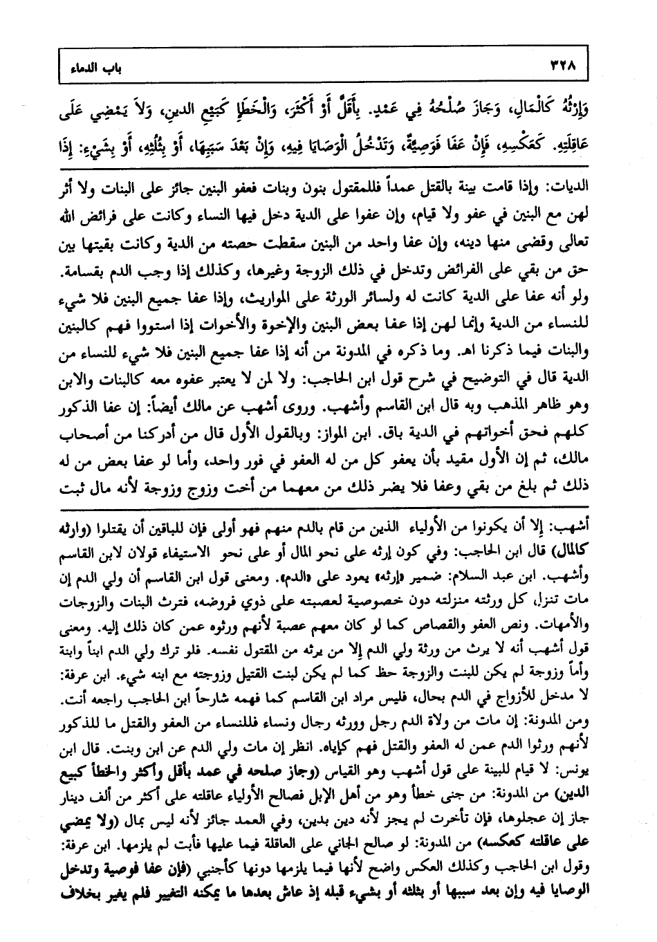 الديات وإذا قامت بينة بالقتل عمدا فللمقتول بنون وبنات فعفو البنين جائز على البنات ولا أثر لهن مع البنين في عفو ولا قيام وإن عفوا على الدية دخل فيها النساء وكانت على فرائض الله تعالى وقضى منها دينه وإن عفا واحد من البنين سقطت حصته من الدية وكانت بقيتها بين حق من بقي على الفرائض وتدخل في ذلك الزوجة وغيرها وكذلك إذا وجب الدم بقسامة ولو أنه عفا على الدية كانت له ولسائر الورثة على المواريث وإذا عفا جميع البنين فلا شيء للنساء من الدية وإنما لهن إذا عفا بعض البنين والإخوة والأخوات إذا استووا فهم كالبنين والبنات فيما ذكرنا ا هـ. وما ذكره في المدونة من أنه إذا عفا جميع البنين فلا شيء للنساء من الدية قال في التوضيح في شرح قول ابن الحاجب: ولا لمن لا يعتبر عفوه معه كالبنات والابن هو ظاهر المذهب وبه قال ابن القاسم وأشهب وروى أشهب عن مالك أيضا إن عفا الذكور كلهم فحق أخواتهم في الدية باق. ابن المواز وبالقول الأول قال: من أدركنا من أصحاب مالك ثم إن الأول مقيد بأن يعفو كل من له العفو في فور واحد وأما لو عفا بعض من له ذلك ثم بلغ من بقي وعفا فلا يضر ذلك من معهما من أخت وزوج وزوجة لأنه مال ثبت