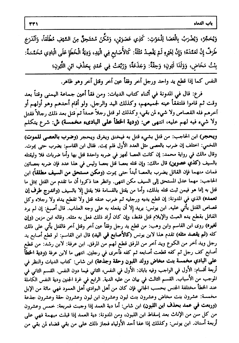 ويحجر ويضرب بالعصا للموت، كذي عضوين ومكن مستحق من السيف مطلقاً، واندرج طرف إن تعمده وإن لغيره لم يقصد مثلة، كالأصابع في اليد ودية الخطإ على البادي مخمسة بنت مخاض، وولد لبون وحقة وجذعة وربع في عمد، بحذف ابن اللبون