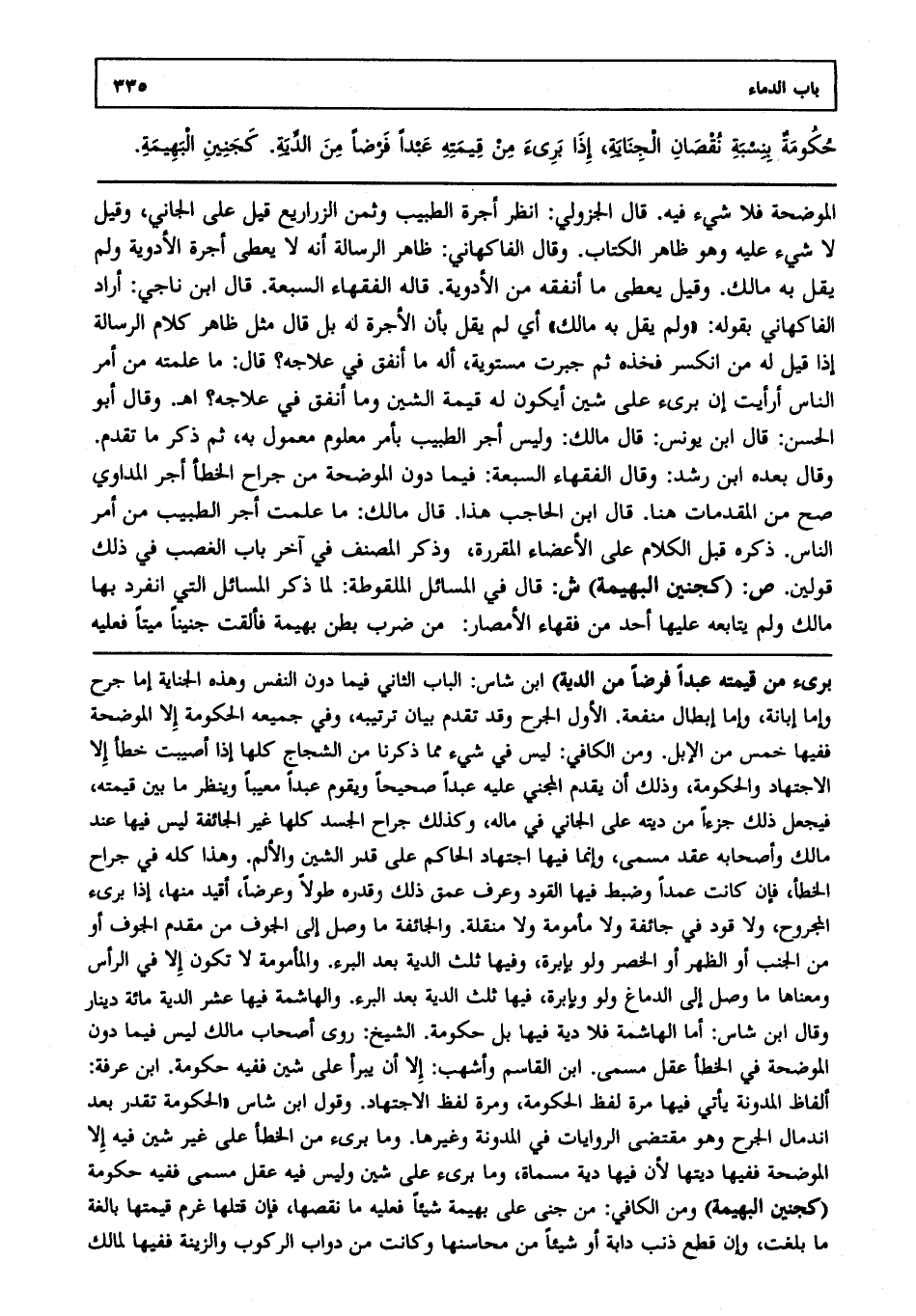 الموضحة فلا شيء فيه، قال الجزولي: انظر أجرة الطبيب وثمن الزراريع قيل: على الجاني وقيل لا شيء عليه وهو ظاهر الكتاب، وقال الفاكهاني: ظاهر الرسالة أنه لا يعطى أجرة الأدوية ولم يقل به مالك، وقيل: يعطى ما أنفقه من الأدوية قاله الفقهاء السبعة، قال ابن ناجي: أراد الفاكهاني بقوله: "ولم يقل به مالك" أي لم يقل بأن الأجرة له بل قال مثل ظاهر كلام الرسالة: إذا قيل له: من انكسر فخذه ثم جبرت مستوية أله ما أنفق في علاجه قال: ما علمته من أمر الناس أرأيت إن برئ على شين أيكون له قيمة الشين وما أنفق في علاجه ا هـ. وقال أبو الحسن: قال ابن يونس: قال مالك: وليس أجر الطبيب بأمر معلوم معمول به ثم ذكر ما تقدم وقال بعده ابن رشد": وقال الفقهاء السبعة: فيما دون الموضحة من جراح الخطإ أجر المداوي صح من المقدمات هنا وقال ابن الحاجب: هذا قال مالك: ما علمت أجر الطبيب من أمر الناس ذكره قبل الكلام على الأعضاء المقررة وذكر المصنف في آخر باب الغصب في ذلك قولين. ص: (كجنين البهيمة) ش: قال في المسائل الملقوطة لما ذكر المسائل التي انفرد بها مالك ولم يتابعه عليها أحد من فقهاء الأمصار: من ضرب بطن بهيمة فألقت جنينا ميتا فعليه