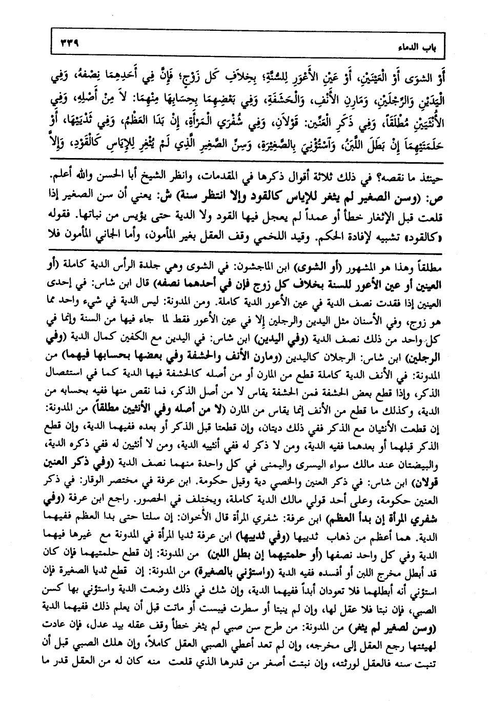 أو الشوى، أو العينين، أو عين الأعور للسنة، بخلاف كل زوج، فإن في أحدهما نصفه وفي اليدين والرجلين، ومارن الأنف، والحشفة، وفي بعضهما بحسابها منهما لا من أصله وفي الأنثيين مطلقا،ً وفي ذكر العنين قولان، وفي شفري المرأة إن بدا العظم، وفي ثدييها أو حلمتيها إن بطل اللبن، واستؤني بالصغيرة وسن الصغير الذي لم يثغر للإياس كالقود وإلا