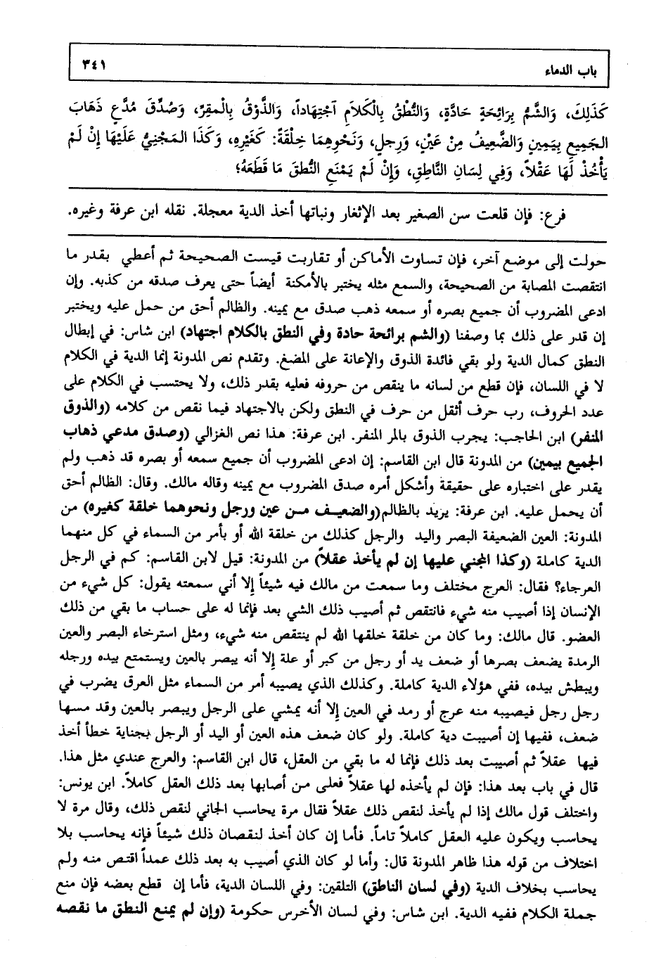 كذلك والشم برائحة حادة، والنطق بالكلام اجتهاداً، والذوق بالمقر، وصدق مدع ذهاب الجميع بيمين والضعيف من عين ورجل ونحوهما خلقة كغيره، وكذا المجني عليها إن لم يأخذ لها عقلاً، وفي لسان الناطق وإن لم يمنع النطق ما قطعه