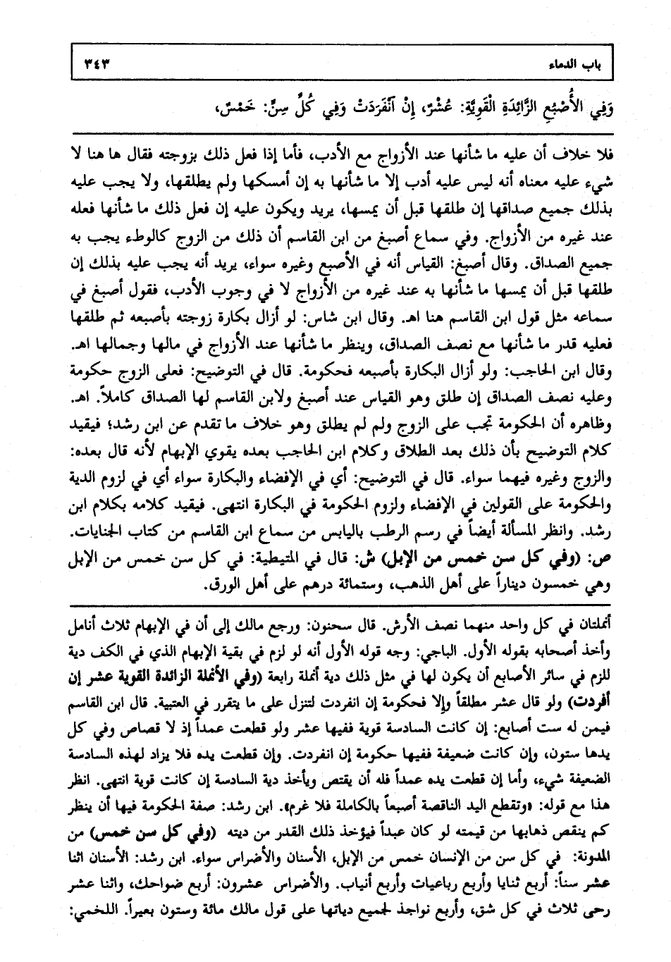 وفي الأصبع الزائدة القوية عشر، إن انفردت، وفي كل سن خمس