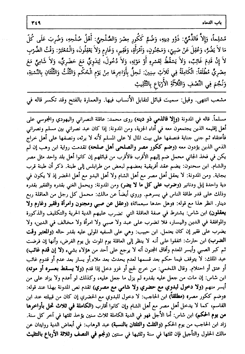 سلماً وإلا فالذمي ذوو دينه، وضم ككور مصر والصلحي أهل صلحته، وضرب على كل مالا يضر وعقل عن صبي ومجنون وامرأة وفقير وغارم ولا يعقلون، والمعتبر وقت الضرب لا إن قدم غائب، ولا يسقط لعسره أو موته، ولا دخول لبدوي مع حضري ولا شامي مع مصري مطلقاً، الكاملة في ثلاث سنين تحل بأواخرها من يوم الحكم والثلث والثلثان بالنسبة، ونجم في النصف والثلاثة الأرباع بالتثليث