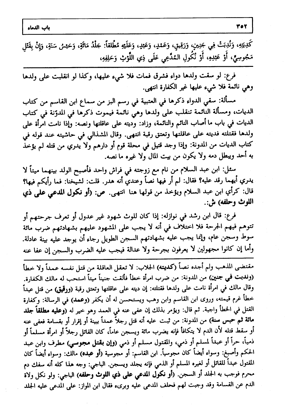 مسألة: سقي الدواء ذكرها في العتبية في رسم البز من سماع ابن القاسم من كتاب الديات ومسألة النائمة تنقلب على ولدها وهي نائمة فيموت ذكرها في المدونة في كتاب الديات في باب ما أصاب النائم والنائمة وزاد وديته على عاقلتها ونصه: وإذا نامت امرأة على ولدها فقتلته فديته على عاقلتها وتعتق رقبة انتهى. وقال المشذالي في حاشيته عند قوله في كتاب الديات من المدونة: وإذا وجد قتيل في محلة قوم أو دارهم ولا يدرى من قتله لم يؤخذ به أحد ويبطل دمه ولا يكون من بيت المال ولا غيره. ما نصه: سئل ابن عبد السلام من نام مع زوجته في فراش واحد فأصبح الولد بينهما ميتا لا يدرى أيهما رقد عليه فقال: لم أر فيها نصا وعندي أنه هدر.