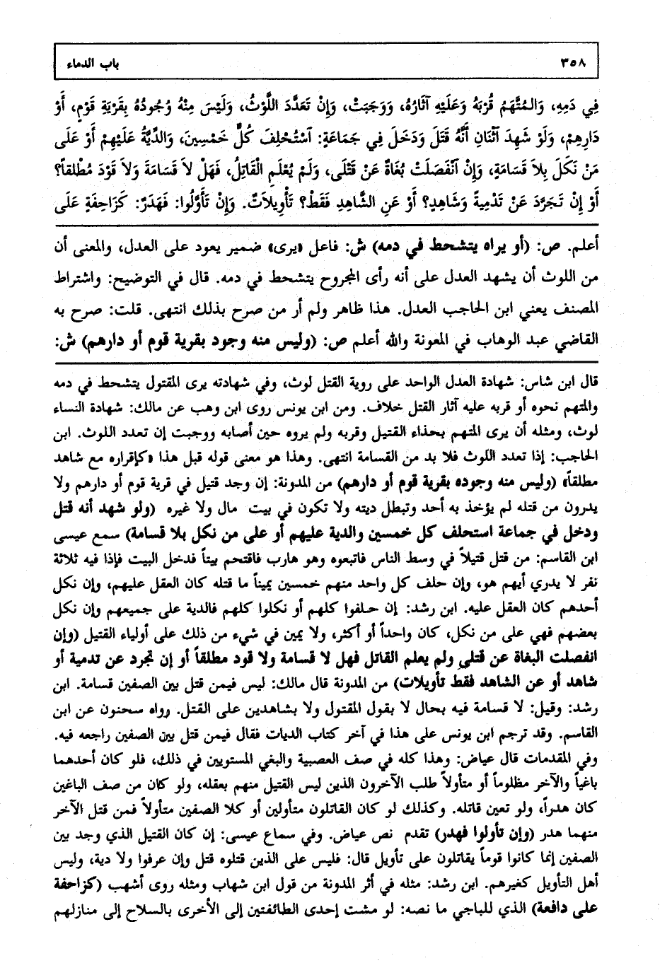 أعلم. ص: (أو يراه يتشحط في دمه) ش: فاعل يرى ضمير يعود على العدل والمعنى أن من اللوث أن يشهد العدل على أنه رأى المجروح يتشحط في دمه قال في التوضيح: واشتراط المصنف يعني: ابن الحاجب العدل هذا ظاهر ولم أر من صرح بذلك انتهى. قلت: صرح به القاضي عبد الوهاب في المعونة والله أعلم. ص: (وليس منه وجود بقرية قوم أو دارهم) ش:
