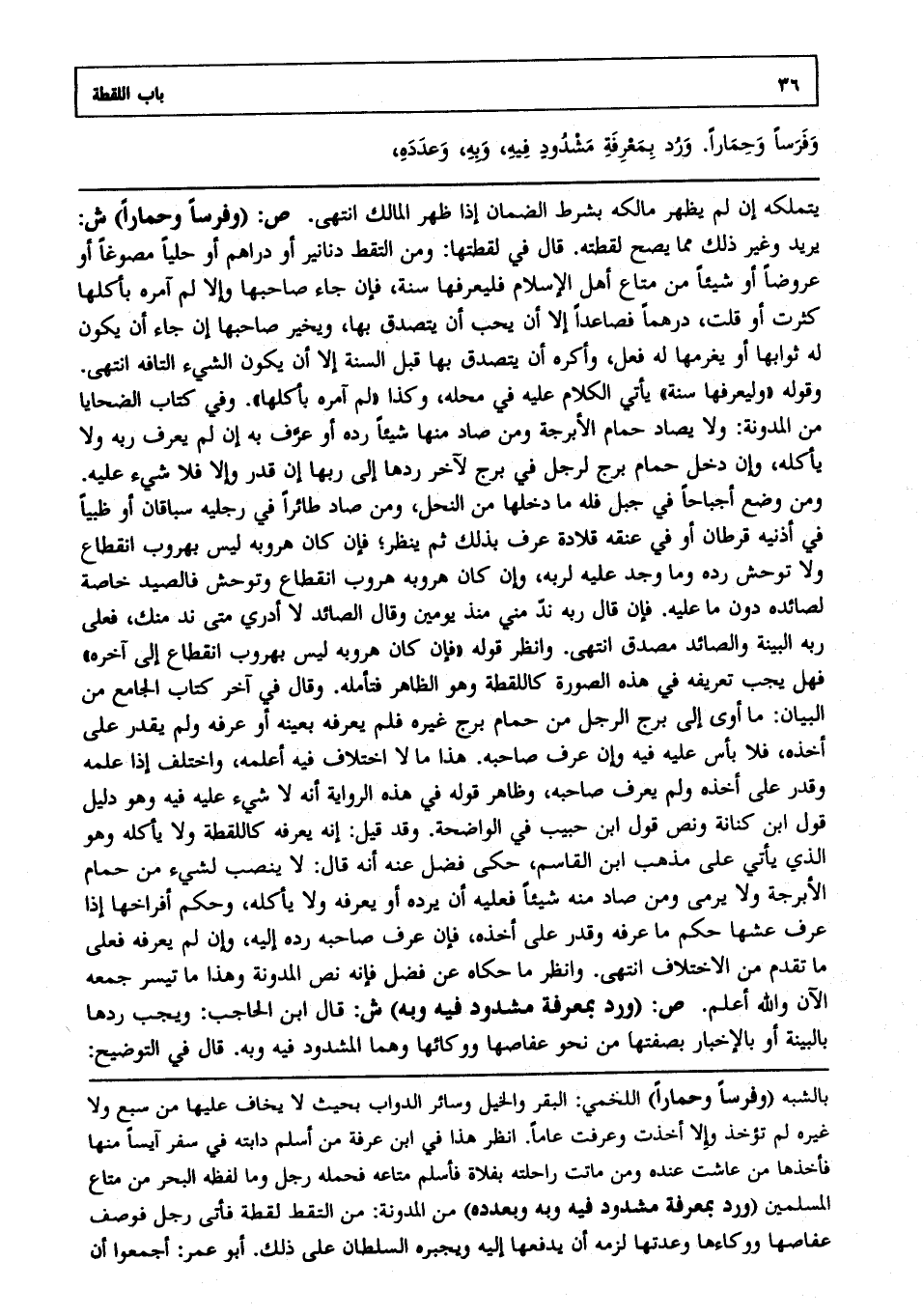 يَتَمَلَّكَهُ إنْ لَمْ يَظْهَرْ مَالِكُهُ بِشَرْطِ الضَّمَانِ إذَا ظَهَرَ الْمَالِكُ، انْتَهَى. ص: (وَفَرَسًا وَحِمَارًا) ش: يُرِيدُ وَغَيْرَ ذَلِكَ مِمَّا يَصِحُّ لُقَطَتُهُ، قَالَ فِي لُقَطَتِهَا: وَمَنْ الْتَقَطَ دَنَانِيرَ أَوْ دَرَاهِمَ أَوْ حُلِيًّا مَصُوغًا أَوْ عُرُوضًا أَوْ شَيْئًا مِنْ مَتَاعِ أَهْلِ الْإِسْلَامِ فَلْيُعَرِّفْهَا سَنَةً فَإِنْ جَاءَ صَاحِبُهَا وَإِلَّا لَمْ آمُرْهُ بِأَكْلِهَا كَثُرَتْ أَوْ قَلَّتْ دِرْهَمًا فَصَاعِدًا إلَّا أَنْ يُحِبَّ أَنْ يَتَصَدَّقَ بِهَا وَيُخَيِّرُ صَاحِبَهَا إنْ جَاءَ أَنْ يَكُونَ لَهُ ثَوَابُهَا أَوْ يَغْرَمُهَا لَهُ فَعَلَ وَأَكْرَهُ أَنْ يَتَصَدَّقَ بِهَا قَبْلَ السَّنَةِ إلَّا أَنْ يَكُونَ الشَّيْءُ التَّافِهُ، انْتَهَى. وَقَوْلُهُ وَلْيُعَرِّفْهَا سَنَةً يَأْتِي الْكَلَامُ عَلَيْهِ فِي مَحَلِّهِ وَكَذَا لَمْ آمُرْهُ بِأَكْلِهَا وَفِي كِتَابِ الضَّحَايَا مِنْ الْمُدَوَّنَةِ وَلَا يُصَادُ حَمَامُ الْأَبْرِجَةِ وَمَنْ صَادَ مِنْهَا شَيْئًا رَدَّهُ أَوْ عَرَّفَ بِهِ إنْ لَمْ يَعْرِفْ رَبَّهُ وَلَا يَأْكُلُهُ وَإِنْ دَخَلَ حَمَامُ بُرْجٍ لِرَجُلٍ فِي بُرْجٍ لِآخَرَ رَدَّهَا إلَى رَبِّهَا إنْ قَدَرَ وَإِلَّا فَلَا شَيْءَ عَلَيْهِ وَمَنْ وَضَعَ أَجْبَاحًا فِي جَبَلٍ فَلَهُ مَا دَخَلَهَا مِنْ النَّحْلِ وَمَنْ صَادَ طَائِرًا فِي رِجْلَيْهِ سِبَاقَانِ أَوْ ظَبْيًا فِي أُذُنَيْهِ قُرْطَانِ أَوْ فِي عُنُقِهِ قِلَادَةٌ عَرَّفَ بِذَلِكَ ثُمَّ يَنْظُرُ فَإِنْ كَانَ هُرُوبُهُ لَيْسَ بِهُرُوبِ انْقِطَاعٍ وَلَا تَوَحُّشٍ رَدَّهُ وَمَا وَجَدَ عَلَيْهِ لِرَبِّهِ وَإِنْ كَانَ هُرُوبُهُ هُرُوبَ انْقِطَاعٍ وَتَوَحُّشٍ فَالصَّيْدُ خَاصَّةً لِصَائِدِهِ دُونَ مَا عَلَيْهِ فَإِنْ قَالَ رَبُّهُ: نَدَّ مِنِّي مُنْذُ يَوْمَيْنِ، وَقَالَ الصَّائِدُ: لَا أَدْرِي مَتَى نَدَّ مِنْك فَعَلَى رَبِّهِ الْبَيِّنَةُ وَالصَّائِدُ مُصَدَّقٌ، انْتَهَى. وَانْظُرْ قَوْلَهُ: "فَإِنْ كَانَ هُرُوبُهُ لَيْسَ بِهُرُوبِ انْقِطَاعٍ إلَى آخِرِهِ" فَهَلْ يَجِبُ تَعْرِيفُهُ فِي هَذِهِ الصُّورَةِ كَاللُّقَطَةِ وَهُوَ الظَّاهِرُ فَتَأَمَّلْهُ، وَقَالَ فِي آخِرِ كِتَابِ الْجَامِعِ مِنْ الْبَيَانِ: مَا أَوَى إلَى بُرْجِ الرَّجُلِ مِنْ حَمَامِ بُرْجِ غَيْرِهِ فَلَمْ يَعْرِفْهُ بِعَيْنِهِ أَوْ عَرِفَهُ وَلَمْ يَقْدِرْ عَلَى أَخْذِهِ فَلَا بَأْسَ عَلَيْهِ فِيهِ وَإِنْ عَرَفَ صَاحِبَهُ هَذَا مَا لَا اخْتِلَافَ فِيهِ أَعْلَمَهُ وَاخْتُلِفَ إذَا عَلِمَهُ وَقَدَرَ عَلَى أَخْذِهِ وَلَمْ يَعْرِفْ صَاحِبَهُ وَظَاهِرُ قَوْلِهِ فِي هَذِهِ الرِّوَايَةِ أَنَّهُ لَا شَيْءَ عَلَيْهِ فِيهِ وَهُوَ دَلِيلُ قَوْلِ ابْنِ كِنَانَةَ وَنَص قَوْلِ ابْنِ حَبِيبٍ فِي الْوَاضِحَةِ. وَقَدْ قِيلَ: إنَّهُ يُعَرَّفُهُ كَاللُّقَطَةِ وَلَا يَأْكُلُهُ وَهُوَ الَّذِي يَأْتِي عَلَى مَذْهَبِ ابْنِ الْقَاسِمِ حَكَى فَضْلٌ عَنْهُ أَنَّهُ قَالَ: لَا يُنْصَبُ لِشَيْءٍ مِنْ حَمَامِ الْأَبْرِجَةِ وَلَا يُرْمَى وَمَنْ صَادَ مِنْهُ شَيْئًا فَعَلَيْهِ أَنْ يَرُدَّهُ أَوْ يُعَرِّفَهُ وَلَا يَأْكُلُهُ وَحُكْمُ أَفْرَاخِهَا إذَا عَرَفَ عُشَّهَا حُكْمُ مَا عَرَفَهُ وَقَدَرَ عَلَى أَخْذِهِ فَإِنْ عَرَفَ صَاحِبَهُ رَدَّهُ إلَيْهِ وَإِنْ لَمْ يَعْرِفْهُ فَعَلَى مَا تَقَدَّمَ مِنْ الِاخْتِلَافِ، انْتَهَى. وَانْظُرْ مَا حَكَاهُ عَنْ فَضْلٍ فَإِنَّهُ نَص الْمُدَوَّنَةِ وَهَذَا مَا تَيَسَّرَ جَمْعُهُ الْآنَ، وَاَللَّهُ أَعْلَمُ. ص: (وَرُدَّ بِمَعْرِفَةِ مَشْدُودٍ فِيهِ وَبِهِ) ش: قَالَ ابْنُ الْحَاجِبِ: وَيَجِبُ رَدُّهَا بِالْبَيِّنَةِ أَوْ بِالْإِخْبَارِ بِصِفَتِهَا مِنْ نَحْوِ عِفَاصِهَا وَوِكَائِهَا وَهُمَا 
