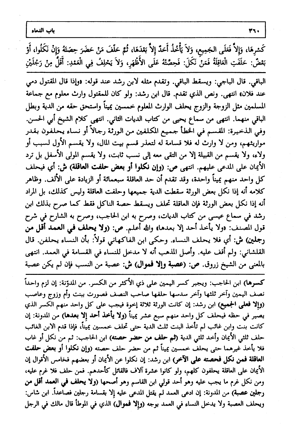 الباقي. قال الباجي: ويسقط الباقي وتقدم مثله لابن رشد عند قوله: وإذا قال المقتول: دمي عند فلان انتهى. ونص الذي تقدم قال ابن رشد: ولو كان للمقتول وارث معلوم مع جماعة المسلمين مثل الزوجة والزوج يحلف الوارث المعلوم خمسين يمينا واستحق حقه من الدية وبطل الباقي منهما انتهى من سماع يحيى من كتاب الديات الثاني. انتهى كلام الشيخ أبي الحسن. وفي الذخيرة المقسم في الخطإ جميع المكلفين من الورثة رجالا أو نساء يحلفون بقدر مواريثهم ومن لا وارث له فلا قسامة له لتعذر قسم بيت المال ولا يقسم الأول لسبب أو ولاء ولا يقسم من القبيلة إلا من التقى معه إلى نسب ثابت ولا يقسم المولى الأسفل بل ترد الأيمان على المدعى عليهم انتهى.