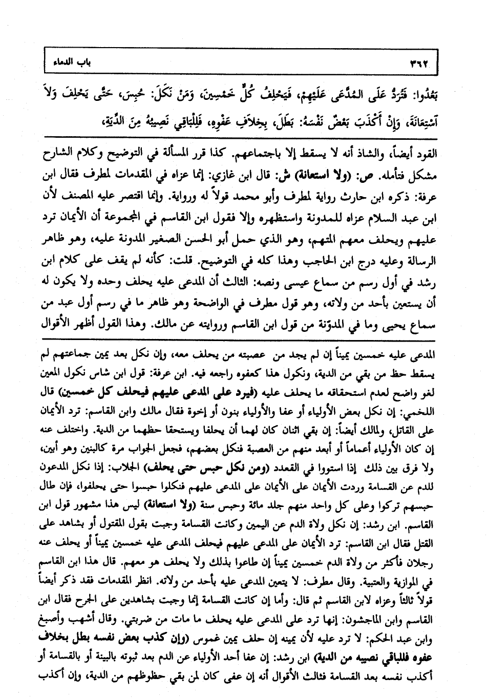 القود أيضا والشاذ أنه لا يسقط إلا باجتماعهم كذا قرر المسألة في التوضيح وكلام الشارح مشكل فتأمله. ص: (ولا استعانة) ش: قال ابن غازي: إنما عزاه في المقدمات لمطرف فقال ابن عرفة: ذكره ابن حارث رواية لمطرف وأبو محمد قولا له ورواية وإنما اقتصر عليه المصنف لأن ابن عبد السلام عزاه للمدونة واستظهره وإلا فقول ابن القاسم في المجموعة أن الأيمان ترد عليهم ويحلف معهم المتهم وهو الذي حمل أبو الحسن الصغير المدونة عليه وهو ظاهر الرسالة وعليه درج ابن الحاجب وهذا كله في التوضيح قلت: كأنه لم يقف على كلام ابن رشد في أول رسم من سماع عيسى ونصه: الثالث: أن المدعى عليه يحلف وحده ولا يكون له أن يستعين بأحد من ولاته. وهو قول مطرف في الواضحة وهو ظاهر ما في رسم أول عبد من سماع يحيى وما في المدونة من قول ابن القاسم وروايته عن مالك وهذا القول أظهر الأقوال