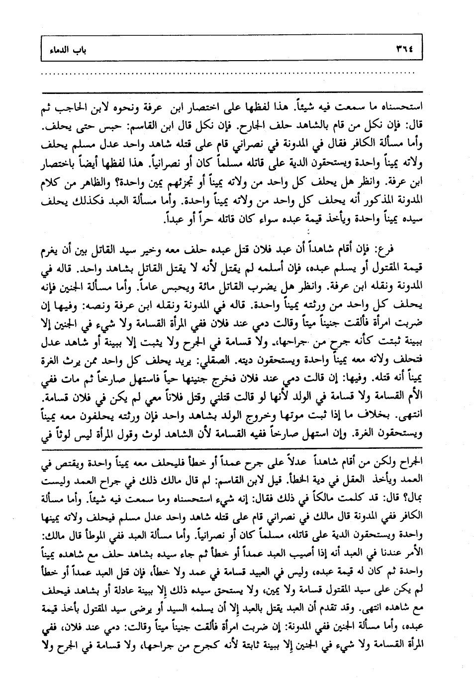 استحسناه ما سمعت فيه شيئا. هذا لفظها على اختصار ابن عرفة ونحوه لابن الحاجب ثم قال: فإن نكل من قام بالشاهد حلف الجارح فإن نكل قال ابن القاسم حبس حتى يحلف وأما مسألة الكافر فقال في المدونة في نصراني قام على قتله شاهد واحد عدل مسلم: يحلف ولاته يمينا واحدة ويستحقون الدية على قاتله مسلما كان أو نصرانيا هذا لفظها أيضا باختصار ابن عرفة وانظر هل يحلف كل واحد من ولاته يمينا أو تجزئهم يمين واحدة؟ والظاهر من كلام المدونة المذكور أنه يحلف كل واحد من ولاته يمينا واحدة وأما مسألة العبد فكذلك يحلف سيده يمينا واحدة ويأخذ قيمة عبده سواء كان قاتله حرا أو عبدا.