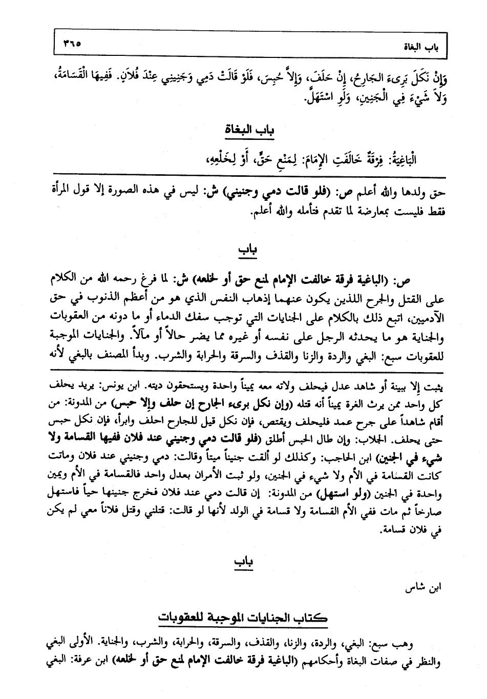 ص: (باب الباغية فرقة خالفت الإمام لمنع حق أو لخلعه) ش: لما فرغ رحمه الله من الكلام على القتل والجرح اللذين يكون عنهما إذهاب النفس الذي هو من أعظم الذنوب في حق الآدميين أتبع ذلك بالكلام على الجنايات التي توجب سفك الدماء أو ما دونه من العقوبات والجناية هو ما يحدثه الرجل على نفسه أو غيره مما يضر حالا أو مالا. والجنايات الموجبة للعقوبات سبع: البغي والردة والزنا والقذف والسرقة والحرابة والشرب. وبدأ المصنف بالبغي لأنه
