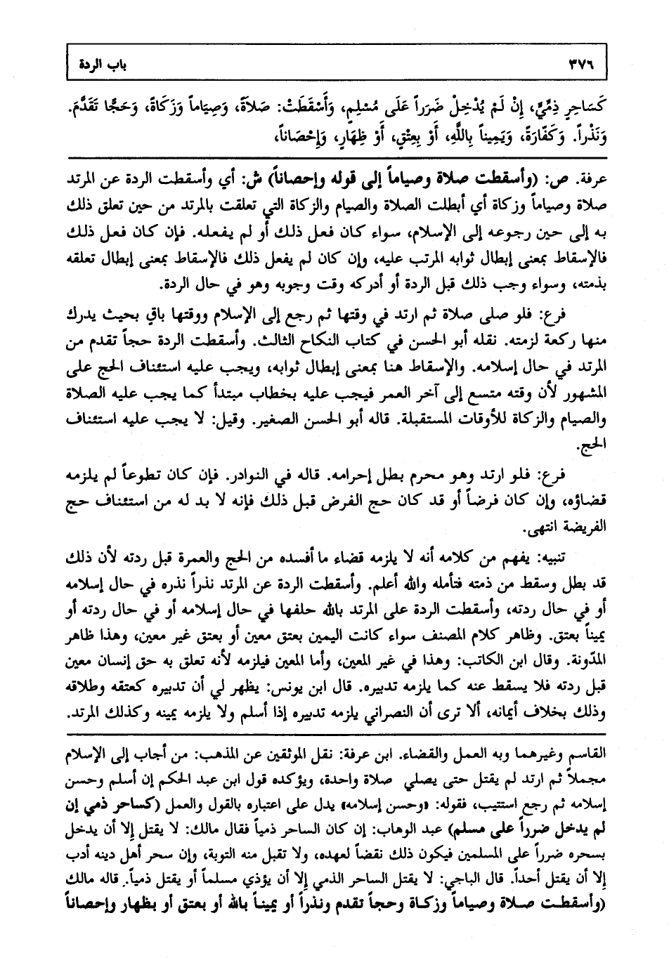 عرفة. ص: (وأسقطت صلاة وصياما إلى قوله وإحصانا) ش: أي وأسقطت الردة عن المرتد صلاة وصياما وزكاة أي أبطلت الصلاة والصيام والزكاة التي تعلقت بالمرتد من حين تعلق ذلك به إلى حين رجوعه إلى الإسلام سواء كان فعل ذلك، أو لم يفعله، فإن كان فعل ذلك فالإسقاط بمعنى إبطال ثوابه المرتب عليه، وإن كان لم يفعل ذلك فالإسقاط بمعنى إبطال تعلقه بذمته. وسواء وجب ذلك قبل الردة أو أدركه وقت وجوبه وهو في حال الردة فرع: فلو صلى صلاة ثم ارتد في وقتها ثم رجع إلى الإسلام ووقتها باق بحيث يدرك منها ركعة لزمته. نقله أبو الحسن في كتاب النكاح الثالث.