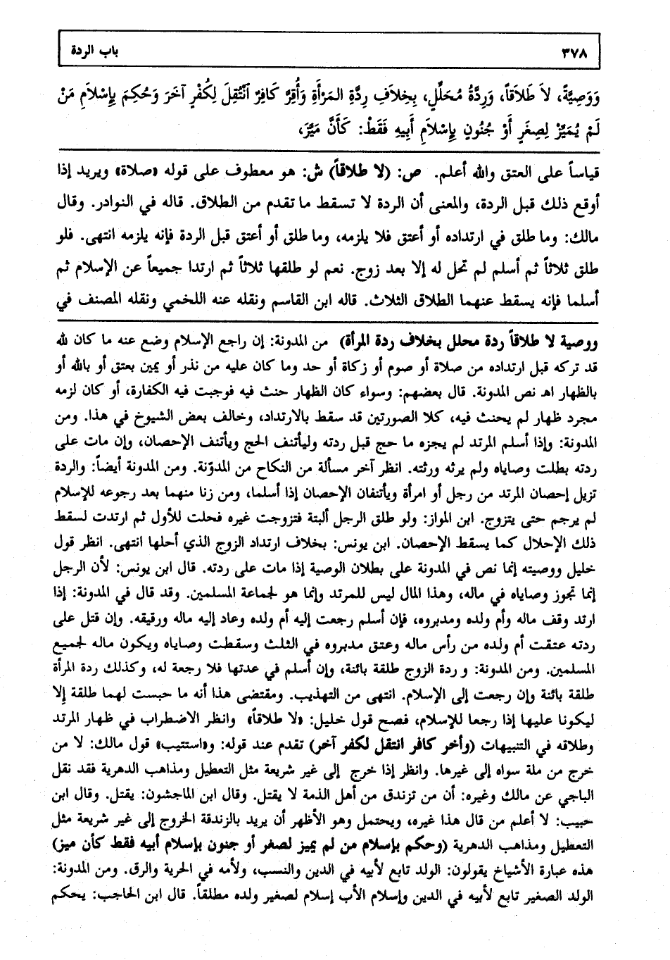ص: (لا طلاقا) ش: هو معطوف على قوله: "صلاة" ويريد إذا أوقع ذلك قبل الردة والمعنى أن الردة لا تسقط ما تقدم من الطلاق قاله في النوادر. وقال مالك: وما طلق في ارتداده أو أعتق فلا يلزمه وما طلق أو أعتق قبل الردة فإنه يلزمه انتهى. فلو طلق ثلاثا ثم أسلم لم تحل له إلا بعد زوج نعم لو طلقها ثلاثا ثم ارتدا جميعا عن الإسلام ثم أسلما فإنه يسقط عنهما الطلاق الثلاث قاله ابن القاسم ونقله عنه اللخمي ونقله المصنف في
