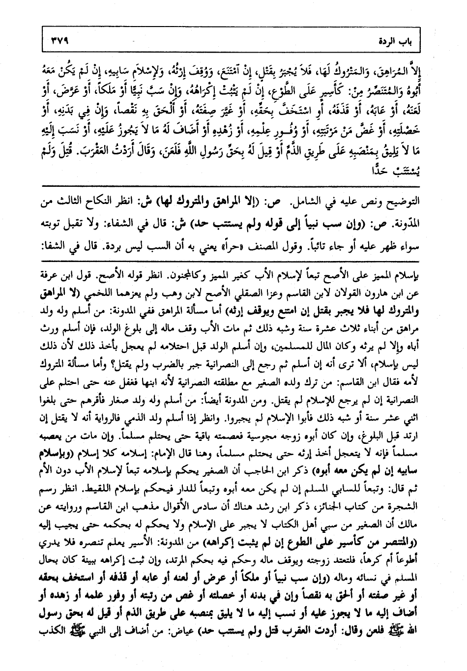 إلا المراهق والمتروك لها فلا يجبر بقتل، إن امتنع ووقف إرثه، ولإسلام سابيه إن لم يكن معه أبوه والمتنصر من كأسير على الطوع، إن لم يكن يثبت إكراهه، وإن سب نبياً، أو ملكاً، أو عرض، أو لعنه أو عابه أو قذفه أو استخف بحقه، أو غيّر صفته، أو ألحق به نقصاً، وإن في بدنه أو خصلته أو غض من مرتبته، أو وفور علمه أو زهده أو أضاف له مالا يجوز عليه، أو نسب إليه مالا يليق بمنصبه على طريق الذم، أو قيل له بحق رسول الله فلعن وقال: أردت العقرب، قتل ولم يستتب حداً